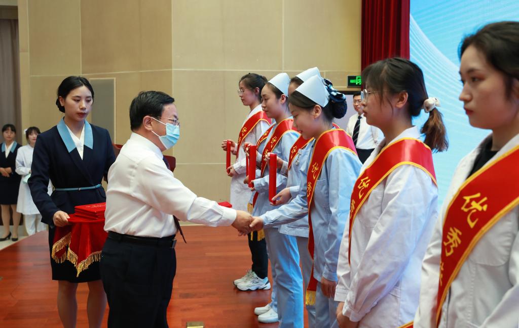 党委书记吉文桥发表了热情洋溢的讲话。他说,毕业典礼是今年会立德树人的最后一课,我们向老师献花,邀请杰出校友为你们人生领航,就是希望母校永远是你们的精神家园。他说,自新冠疫情爆发以来,我们更加感受到医护人员职业的神圣。2022年4月5日凌晨,学校接到省疫情防控工作指挥部支援苏州核酸采样工作指令,立即组织51名教师驰援苏州,在全省6所医学院校组成的6支队伍当中,我们的老师是最后撤离的,他们以自己的艰辛工作赢得了当地政府和群众的一致好评,展示了大爱精神。