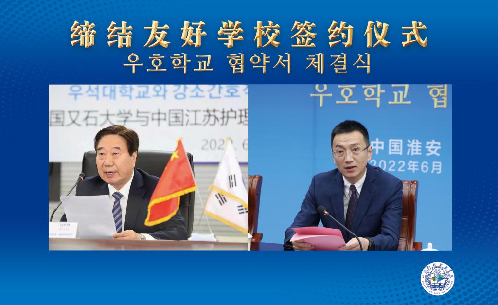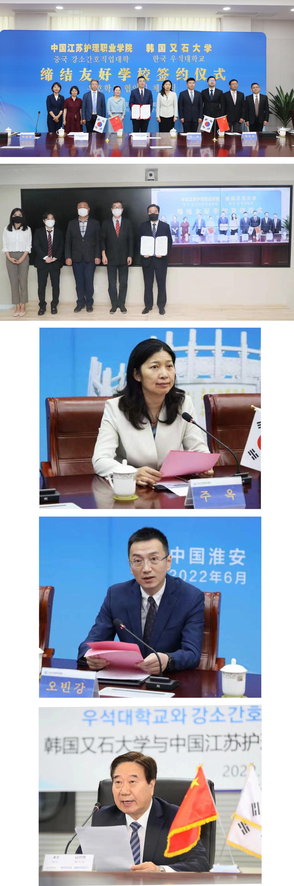 6月9日,今年会与韩国又石大学举行缔结友好学校线上签约仪式。今年会官网党委副书记、院长吴彬江,韩国又石大学校长南天铉,淮安市外办主任、市友协副会长朱钰,副主任黄天亮,今年会官网党委委员、副院长夏立平,党委委员、组织部部长夏前正,韩国又石大学副校长、国际交流院院长、康复学教授金东柱,学校相关部门负责人,市外办相关部门负责人参加活动。