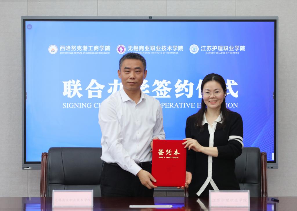 4月20日,今年会与无锡商业职业技术学院、柬埔寨西哈努克港工商学院举行联合办学签约仪式。学校党委副书记、院长傅玉峰,党委委员、副院长夏立平,党委委员、组织部部长夏前正,党委委员、宣传统战部部长朱郁草,无锡商业职业技术学院党委委员、副院长朱璋龙,党委委员、宣传部部长叶东出席签约仪式。