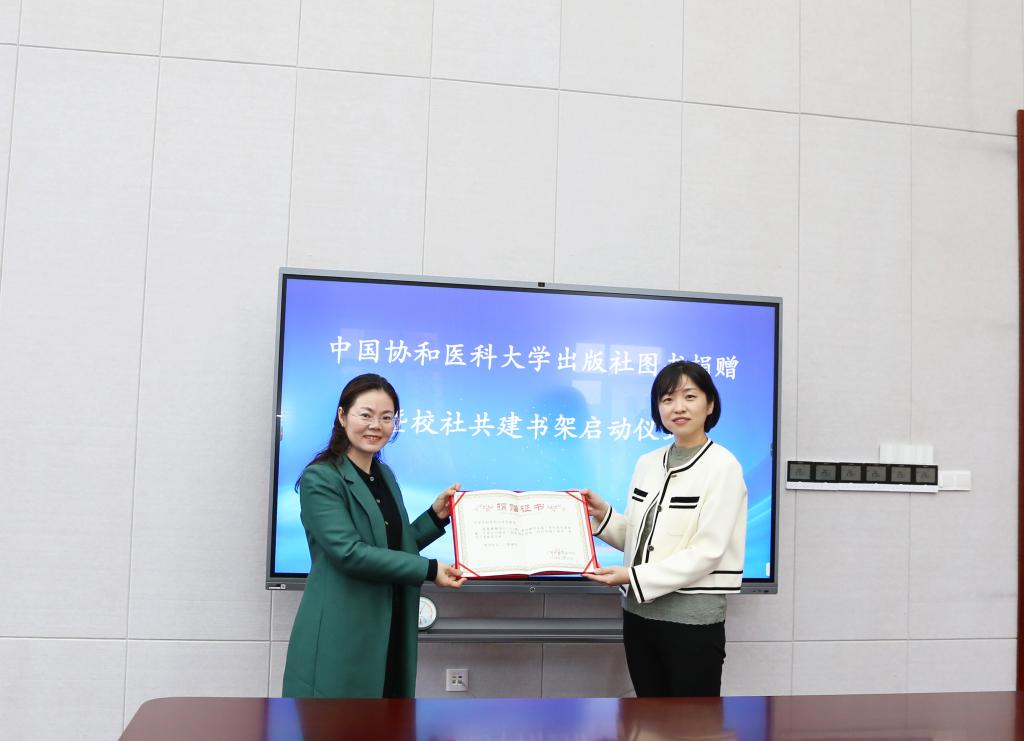 仪式上,张晓雪代表中国协和医科大学出版社向今年会捐赠了价值约8万元的1350册图书,夏立平代表学校接受捐赠,并向捐赠方颁发了捐赠证书。
