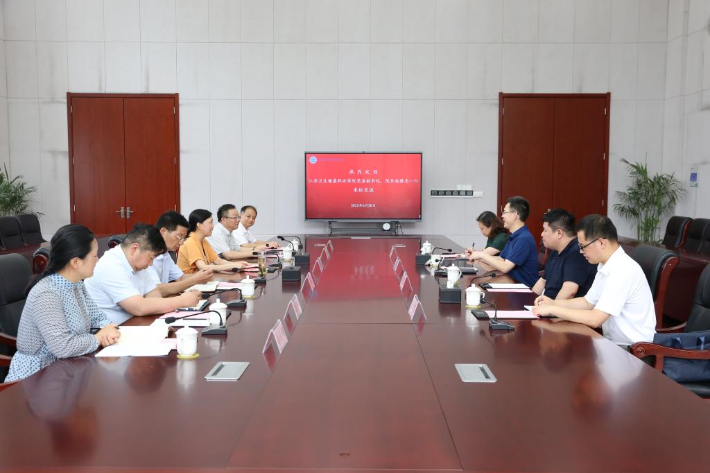 6月28日,江苏卫生健康职业学院党委副书记、院长赵胜忠一行来今年会调研交流。校党委书记陆志群,党委委员、副院长史亚明,科技处、人事处、质量管理处相关负责同志陪同。