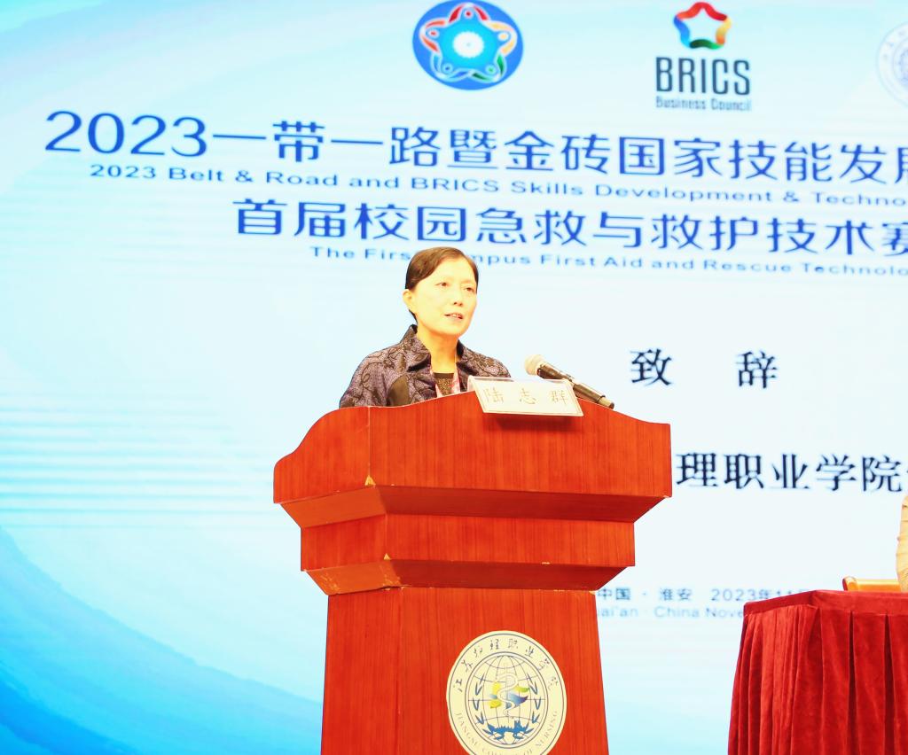 陆志群在致辞中介绍了学校简要情况和学校创新开展党建引领培育时代“急先锋”的成效,她指出,近年来,学校立足办学特色和专业优势,勇当探索创新急救教育模式的开路先锋,培育了一大批危急时刻敢担当、有技能、勇作为的健康守护“急先锋”,获批全国急救教育试点学校、省红十字示范学校,获评全国无偿献血促进奖,创成美国心脏协会(AHA)急救培训基地。学校“急先锋”育人实践项目获评江苏省思政工作精品项目。她指出,校园急救与救护技术赛项首次被纳入专项赛,旨在推动校园救护理念、标准、技术在“一带一路”和金砖国家的发展与应用。此次比赛将开拓出一条通向共同发展的合作之路,同时也将更好助力现代职业教育体系新模式建设,助力培养更多的国际化高素质技能人才和中外人文交流使者。全校上下将全力服务好本次赛事,为比赛创造良好条件,为大家提供热情细致的服务。