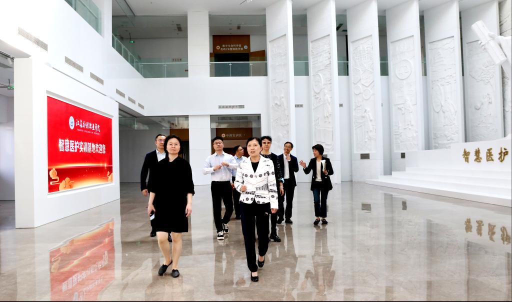 陆志群陪同杨利红一行考察了智慧医护实训基地等实训教学场所,介绍了今年会办学历史以及高质量发展建设的办学成果和发展特色,希望校企双方不断加强深度合作,共同推动人才培养和产业发展,实现资源共享、优势互补和互惠共赢。