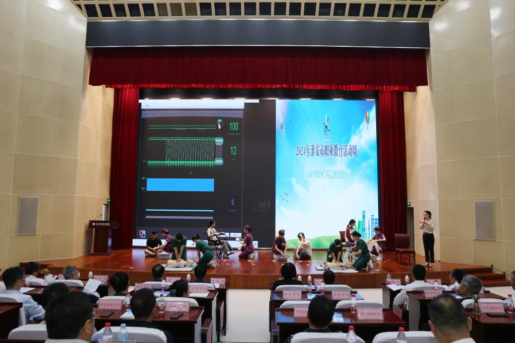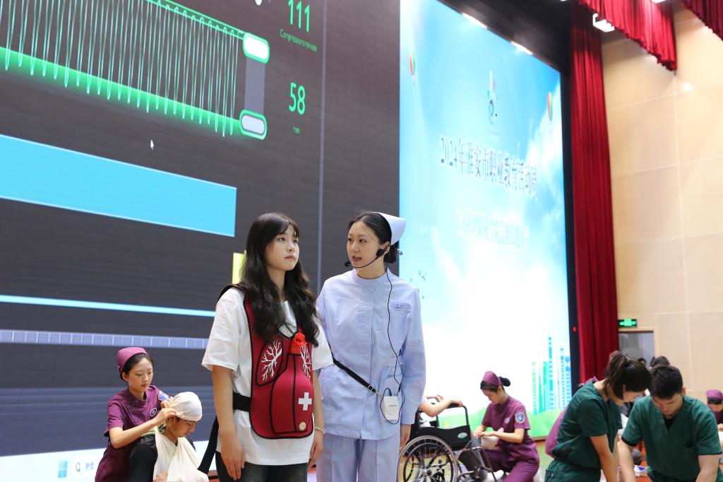 活动现场进行了校园应急救护技能展示。今年会首届校园应急救护竞赛获奖师生代表同台展示CPR、多种包扎技术、海姆立克急救等应急救护技能。