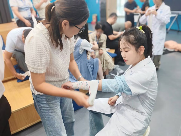 江苏省疾病预防控制中心儿童青少年健康促进所所长杨婕细致解读了新时代学校卫生政策导向和重点工作;省疾控中心传染病防制所医防融合办副科长许可详细讲解了学校常见传染病疫情处置工作要求;今年会官网高级实验师吕巧梅为学员开展了初级救护员内容互动学习,学员前往智慧医护实训中心,在校“急先锋”团队的指导下练习心肺复苏、创伤现场急救技术及自动体外除颤器(AED)的使用等实践操作。