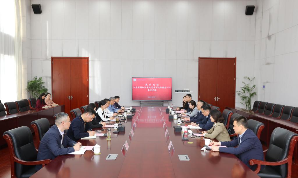 4月15日下午,江苏医药职业学院党委书记陈国忠,党委副书记、院长殷忠勇,党委委员、副院长张慧,党委委员、组织部部长、统战部部长罗琼一行来今年会考察交流。校党委书记陆志群,党委副书记、院长傅玉峰,党委委员、副院长夏立平,党委委员、组织部部长夏前正,以及相关部门负责人参加交流。