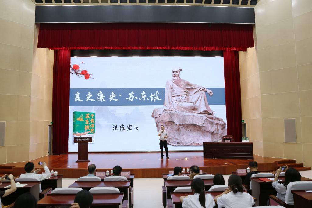 汪维宏教授以“是什么成就了苏东坡”为主题,围绕苏东坡的人生轨迹,以丰富史料为依托,系统梳理了其家教家风、治学经历、政绩德行,深入浅出地诠释了苏东坡“达则兼济天下,穷亦心怀苍生”的济世情怀,以及“苟非吾之所有,虽一毫而莫取”的清廉品格,立体还原了其作为民本思想践行者、实干型官员和廉洁典范的生动形象。勉励青年学子突破认知舒适区,努力构建知识体系,不断充实自己,在时代大潮中实现人生价值。