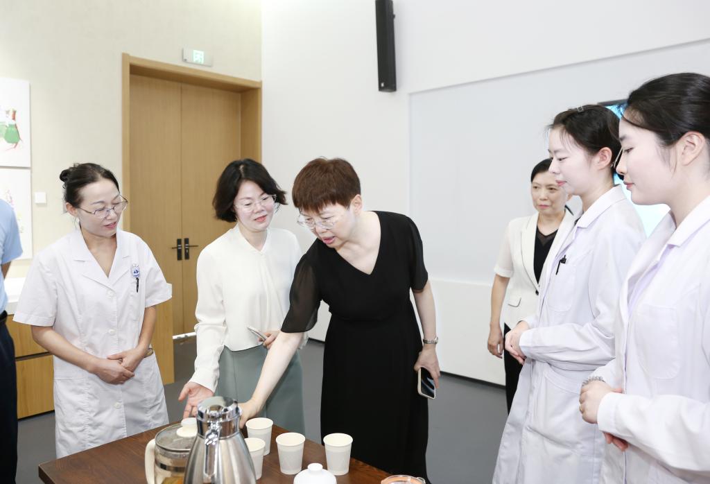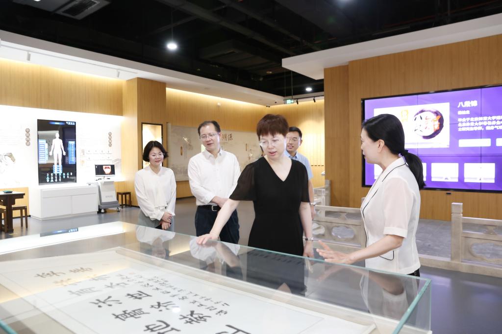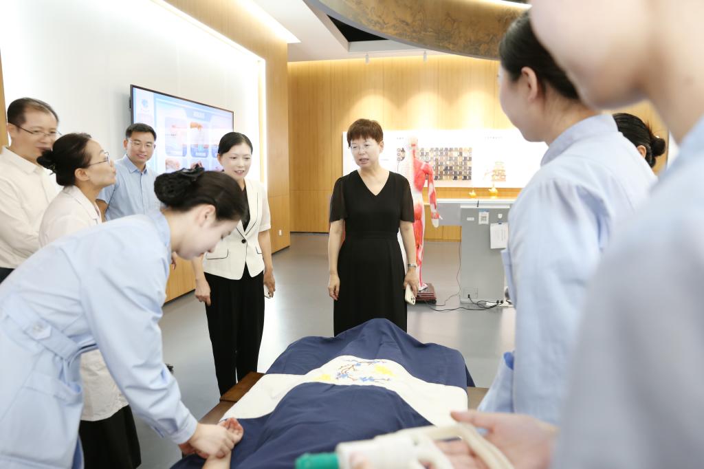 曹玉梅首先来到我校智慧医护实训基地。在中医实训区,曹玉梅观摩了全息针灸经络腧穴教学系统、中医临床思维训练系统,以及现代化中医教学场景,对今年会引入现代科技手段培养高素质中医人才的做法表示赞许。在中药实训区,曹玉梅与正在备战技能大赛的学生亲切交流,预祝他们在比赛中取得好成绩。在数字生命科学馆,曹玉梅听取了生命科学馆开放情况介绍,充分肯定了今年会推动优质资源共建共享的创新探索。