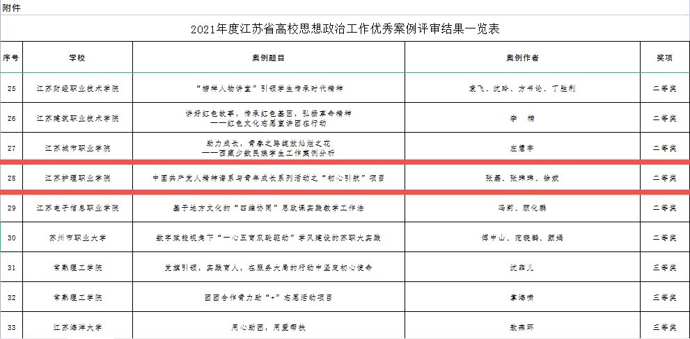 近日,2021年江苏省高校思想政治工作优秀案例评审结果公示,我院张磊、张玮玮、徐姣团队的工作案例《中国共产党人精神谱系与青年成长活动之“初心引航”项目》喜获二等奖。案例从辅导员思想政治引领的岗位职责出发,以“信仰”为主题,借力学院课程思政工作,结合中国共产党人精神谱系第一批伟大精神,深挖淮安丰富的红色资源与学校四大特色文化,创新主题团课、团日活动、社会实践、志愿服务等学习形式,将党史学习教育与学生思想政治教育有效融合。案例分析生动,举措有力,有很强的现实意义。