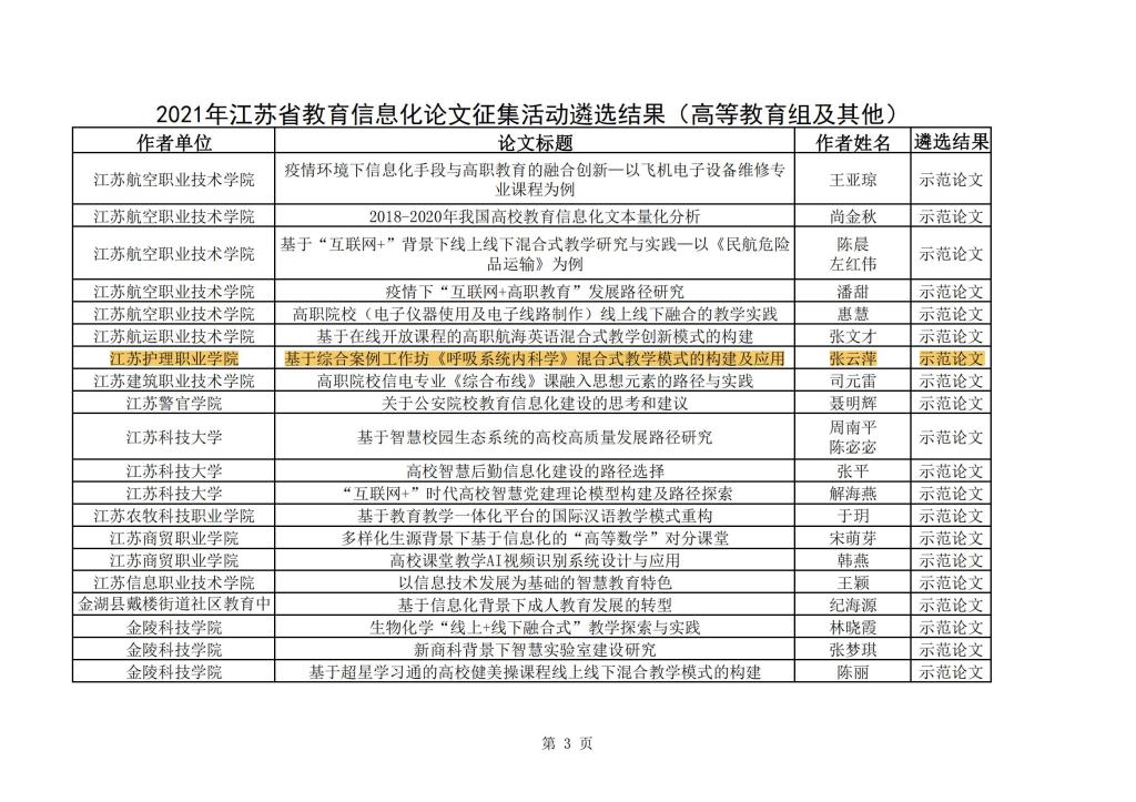 近日,2021年江苏省教育信息化论文征集活动的遴选工作已经圆满结束。根据苏教信办〔2022〕4号精神,本次论文征集活动收到全省投稿论文共10881篇。经专家遴选并公示后,共产生获奖论文1721篇,其中高等教育组及其他197篇。今年会护理与助产学院张云萍老师所属团队获得高等教育组示范论文,这是今年会教改研究项目的成果之一,也是护理与助产学院教学团队与淮安一院呼吸与危重医学科共同开展的研究成果。