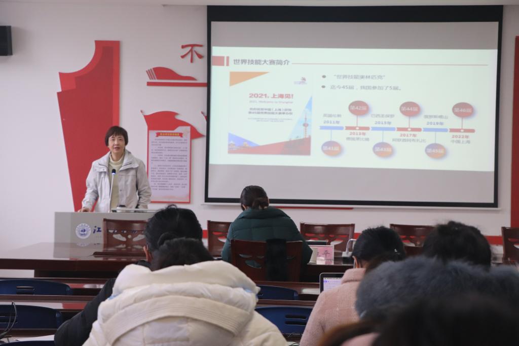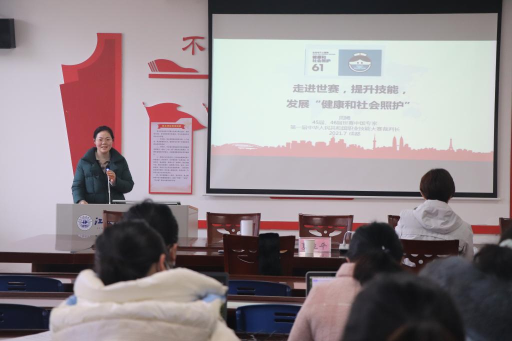 夏立平介绍了学校及学院基本情况,表达了学校对职业技能大赛健康和社会照护项目的高度重视以及对周嫣主任的感谢。周主任介绍了世界技能大赛中“健康和社会照护”项目的理念、比赛环节的设定,代表性的比赛案例、评分标准、SP的功能和特点等,并对国内外比赛的关注点进行了细致的解读。她强调,在比赛中一定要以照护对象为中心,关注照护对象的反馈,满足照护对象的需求,充分体现人文关怀,体现对被照护者全生命周期的健康和社会的整体照护。周主任还从6个维度对比赛的评分细则进行了详细地解析,细致生动地阐述了比赛过程中环节把握和时间控制的小技巧。