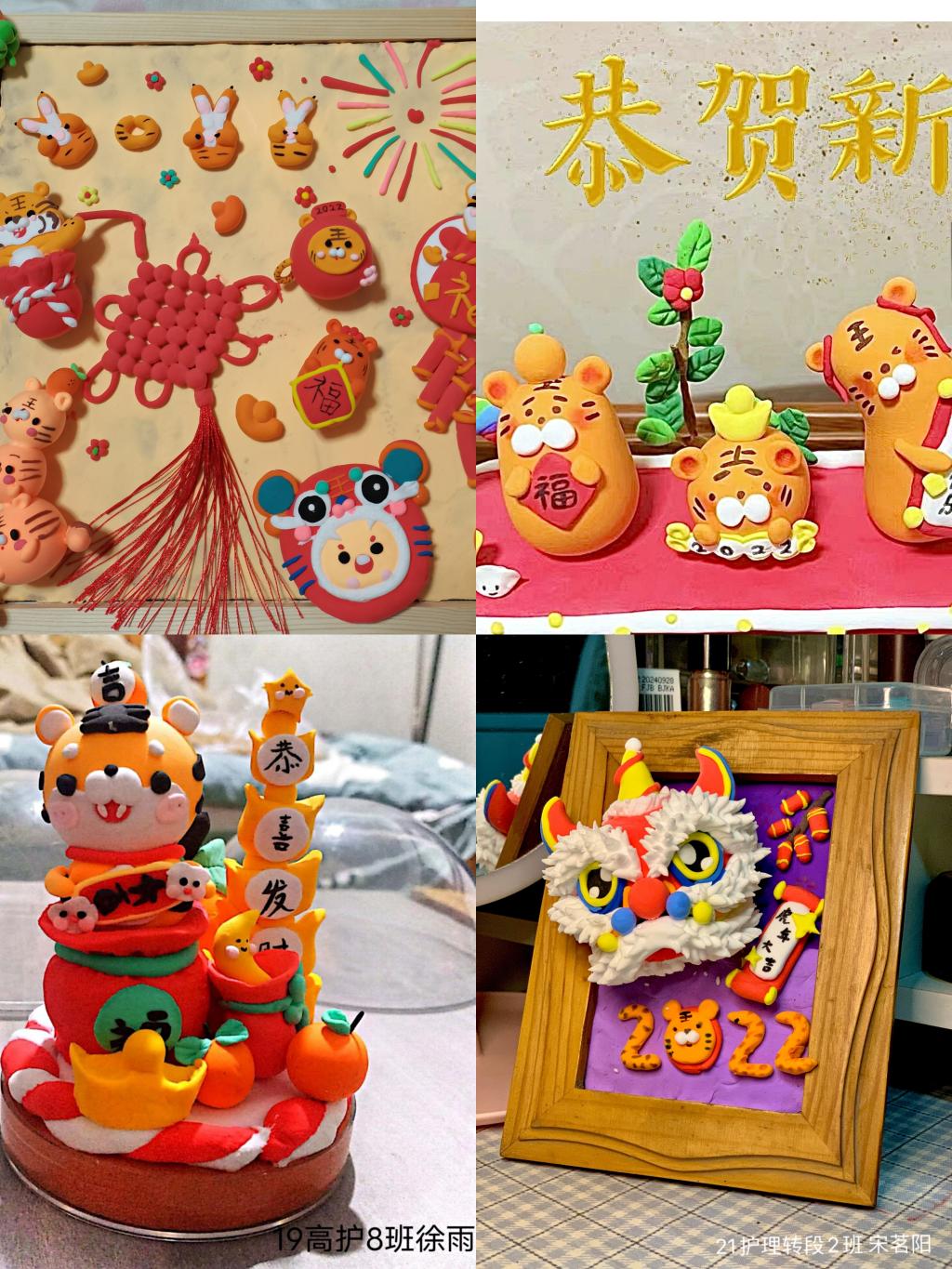 同学们纷纷积极报名,迎新春、写对联、纳福字、剪窗花,大家积极参与主题活动。“户纳千祥景色新,门迎百福春色好”寄予了同学们对新春的热烈期望与希冀,精美的虎年剪纸寄托了同学们浓浓的新春祝福。同学们亲手捏制的虎年浮雕彩泥,不仅锻炼了大家的动手能力,丰富了同学们的寒假生活,营造了浓厚的新年氛围,为这个壬寅虎年增添了浓浓年味和别样色彩,弘扬了中华优秀传统文化。