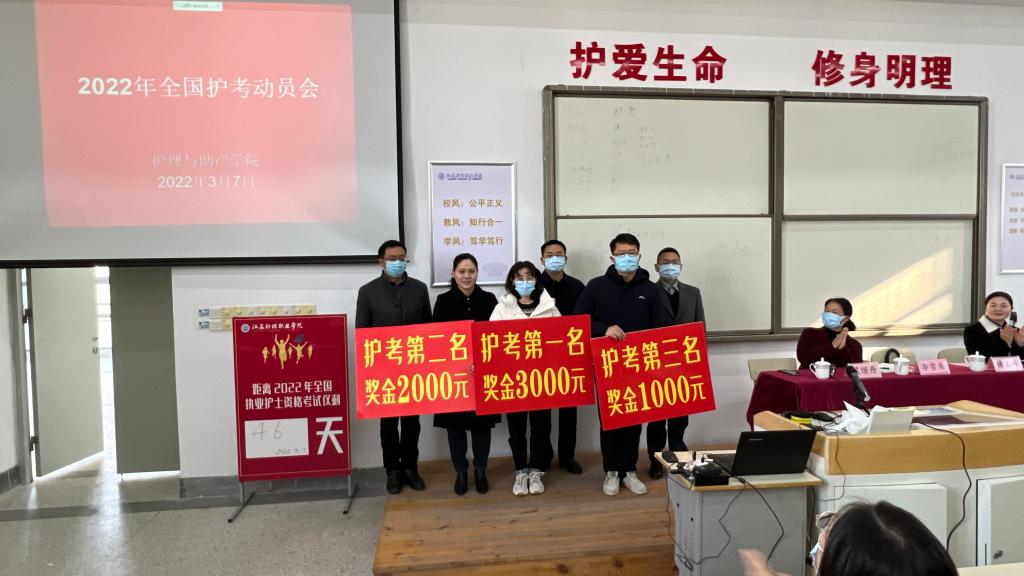 会上,侯继丹布置了2022年护士执业资格考试及辅导相关工作,汤春菊也布置了毕业前学生管理相关工作。全体师生共同聆听了2021年护考成绩第一名程瑞同学和强化班代表王琦同学的发言,傅玉峰副院长、李雪甫处长、丁善戎处长分别为2021年护考前三名的同学颁发奖金。