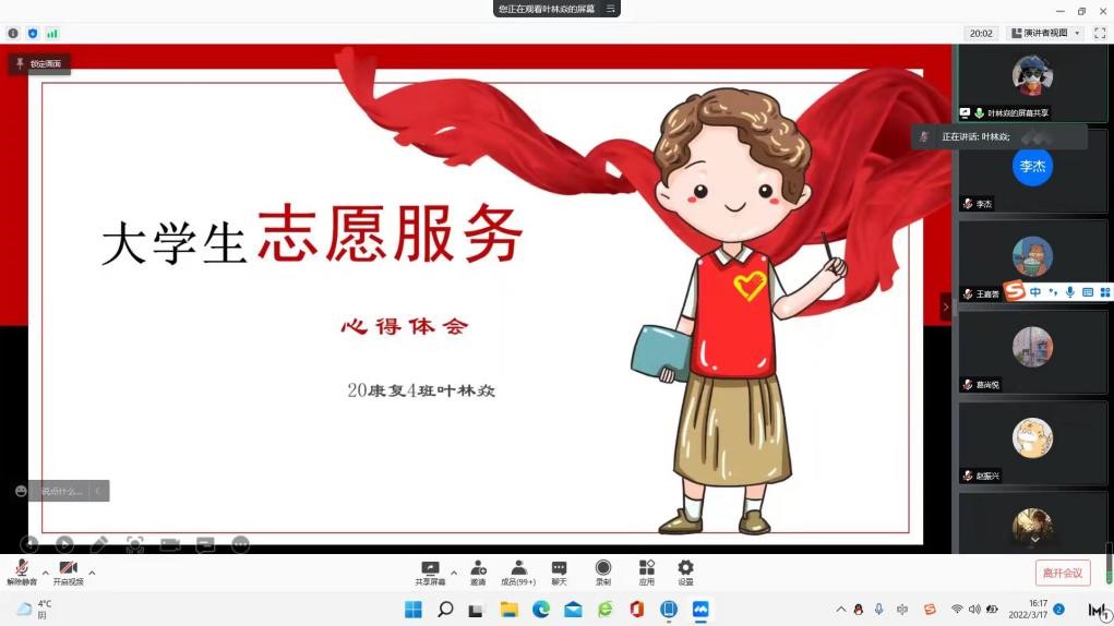 为充分发挥优秀学生在思想引领、志愿服务等方面的榜样示范作用,激励康复学子奋发图强,我院于3月17日开展“励志 成才”优秀学生经验分享线上交流会。健康与康复学院全体在校学生参与。