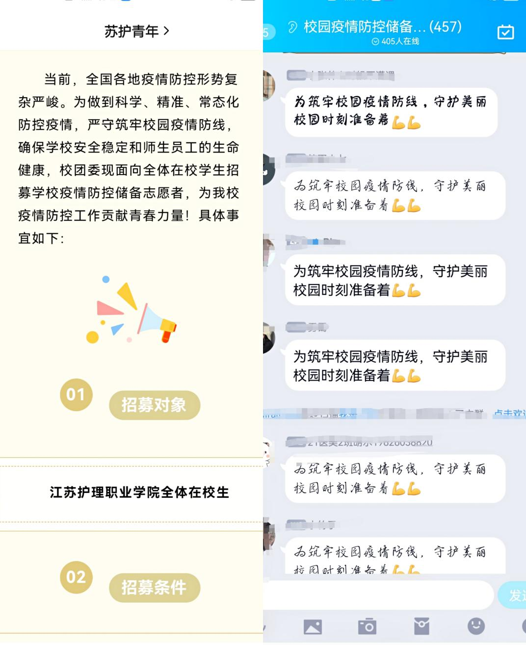 3月19日,校团委向全体在校学生发出了关于组建疫情防控储备志愿者队伍的倡议并得到积极相应。招募消息发布仅数小时,就有超过450名同学踊跃报名。每一条入群申请信息和每一张“新人报到”的名片背后,都跳动着一颗担当作为的心。“为筑牢校园疫情防线、守护美丽校园时刻准备着。”“什么时候可以开始工作?”“现在我能做什么?”同学们纷纷表示随时待命,他们用自身实际行动表达对学校疫情防控工作的支持,用责任和热血筑起了疫情防控的坚固防线。