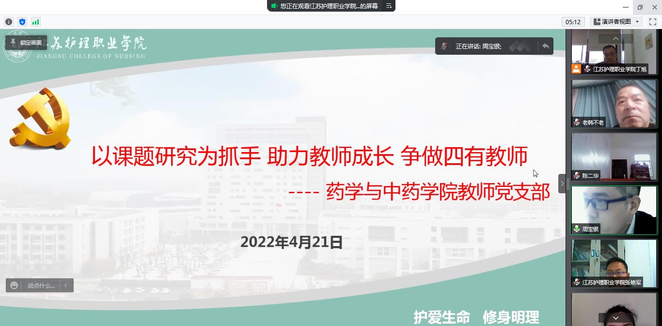 为贯彻落实学校轮岗住校,教职工居家办公要求,做到任务不变,责任不减,聚力推进高质量发展,加强药学专业群师资队伍建设,提高教师整体素质,努力打造一支师德高尚、业务优良、基本功扎实的教师队伍,强化课题意识,提高教师对课题的研究水平,助力教师专业成长,药学与中药学院教师党支部开展主题党日活动。本次活动特别邀请“天医星”特色文化研究院周宝银院长参加。