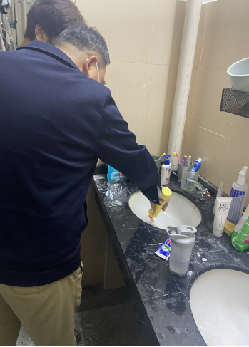 杨铤主任在看到宿舍水池存在一定黄垢现象后,直接给学生做起了示范,他拿起钢丝球反复擦拭,手把手的教导学生如何使用清洁工具清除水池、厕所、地面等地区的污渍,并语重心长的叮嘱学生,疫情下,宿舍是同学们生活的主要场所,确保宿舍“颜值”,才能把牢疫情防控线。他指出,要在日常生活中做好每天的卫生清洁和消杀工作,才能营造舒适健康的居住环境,为校园防疫打好基础。