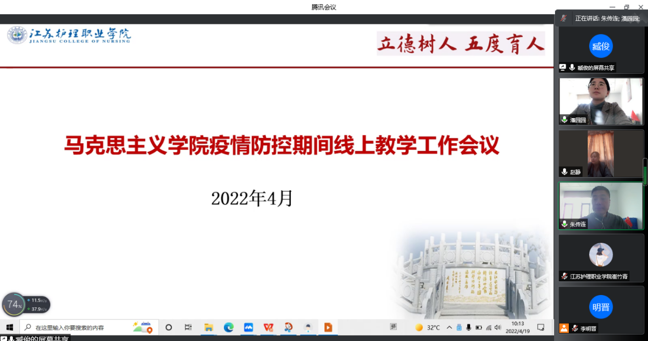 为有序开展好疫情防控期间线上教学工作,4月19日上午,马克思主义学院通过腾讯会议,以视频连线方式召开线上教学工作会议,对近期线上教学工作情况进行总结,对存在的问题与不足进行整改完善,对下一步线上教学、教研、督查等工作进行安排部署。会议由马克思主义学院副院长朱传连主持,马院全体教师参加会议。