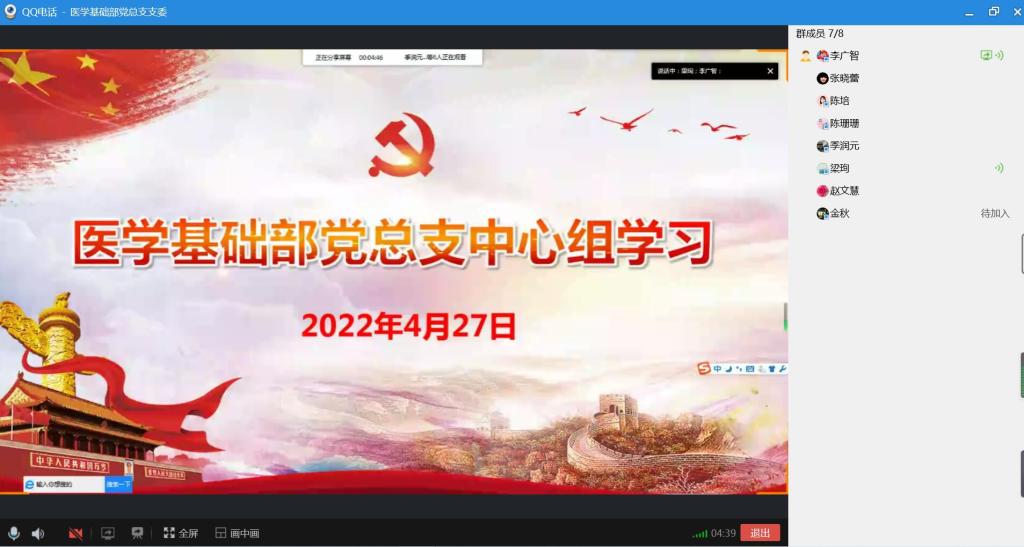 为深入学习贯彻2022年全国两会精神,深刻领悟习近平新时代中国特色社会主义思想,促进各项工作高质量发展,4月27日下午,医学基础部党总支理论学习中心组召开线上专题会议,传达学习全国两会精神特别是习近平总书记重要讲话精神及政府工作报告,认真研究贯彻落实意见。会议由医学基础部党总支副书记梁珣同志主持,总支委员、支部书记参会,季润元主任特邀参会。