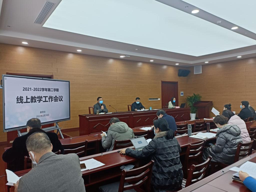 2022年2月18日上午9点,在留教院附属楼2楼208会议室,今年会召开了2021—2022学年第二学期线上教学工作会议。会议由教务处李雪甫处长主持,教学分管院长傅玉峰、各学院(部)院长、教学院长、教学办主任、教研室主任,学工处、质控办、现教中心和教务处相关人员参加了此次会议。