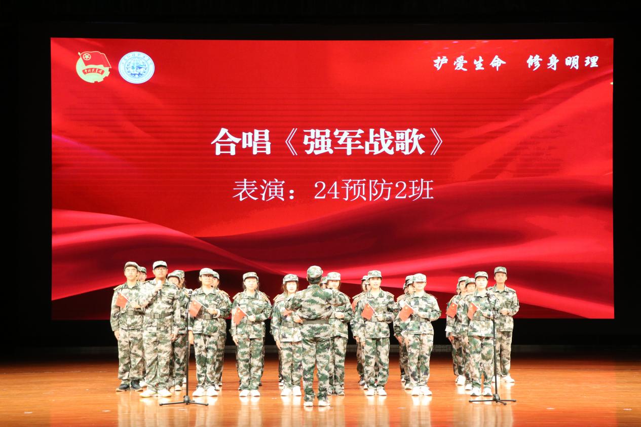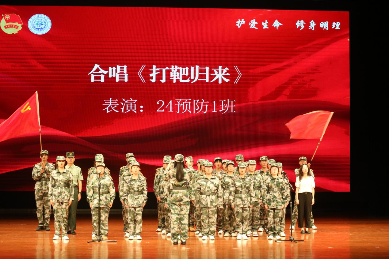 紧接着,24检验3班带来了《祖国不会忘记》。“在征服宇宙的大军里,那默默奉献的就是我……”深情的旋律和动人的歌词,表达了对那些为国家默默奉献的人们的敬意和赞美。同学们用真挚的情感,唱出了对祖国的感恩之情,让现场观众无不为之动容。“日落西山红霞飞,战士打靶把营归把营归……”欢快的《打靶归来》响起,24预防1班的同学们以轻松活泼的表演形式,展现了军人在训练之余的欢乐与活力。他们的歌声仿佛把大家带到了火热的军营生活中,让人感受到了军人的乐观与坚韧。