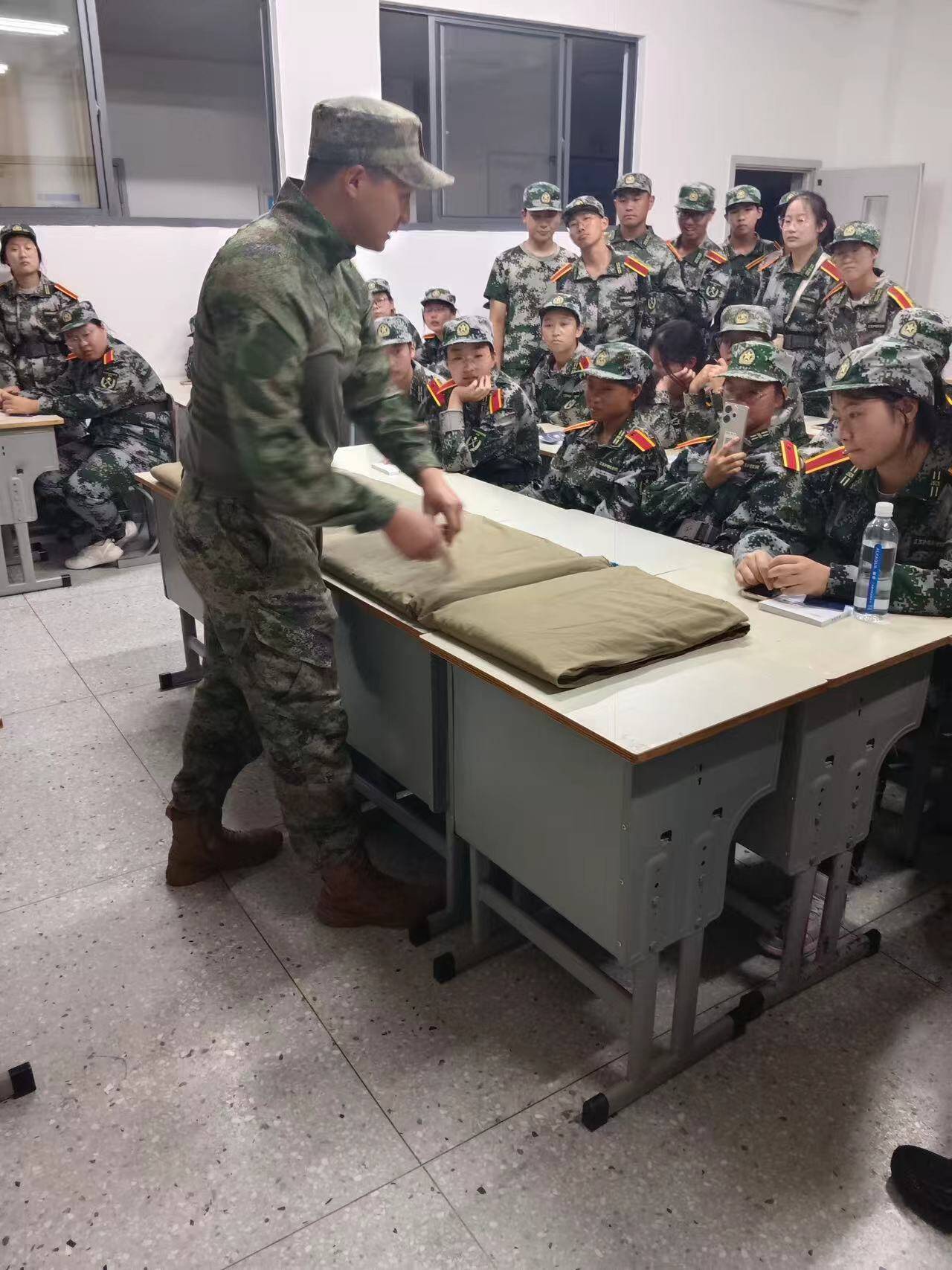 此次军训,学院高度重视国防教育的融入,通过开展军事理论课程,让同学们深入了解我国的国防历史、国防政策和军事战略,激发同学们爱国热情和责任感。在内务整理教学中,学生教官示范如何将床铺整理平整,把被子叠成方正“豆腐块”,并指导同学们物品摆放规范与地面清洁标准。同学们纷纷动手实践,经过评选,30间内务优秀宿舍获得校级表彰。