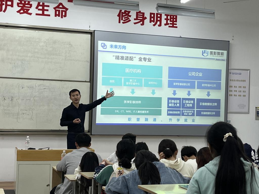医学影像技术专业教育由专业负责人石庚生和来自山东医影智能科技有限公司的高级工程师杨帆共同为2024级新生带来专业教育讲座。帮助2024级新生明确专业的发展前景以及就业所需要的核心竞争力,在讲座中鼓励大家多学科融合,掌握信息技术相关知识增强专业的不可替代性,为将来就业打下坚实基础。