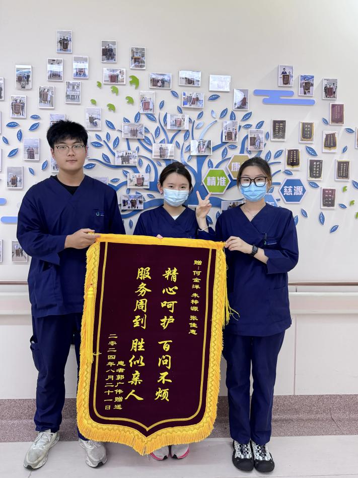 在实习期间,三位同学遇到了一位因“高血压性脑出血导致的左侧偏瘫”而入院的患者,左侧肢体活动严重受限。经医生的诊断,三位同学在带教老师的指导下为患者设计了一套针对性的运动治疗方案。在他们认真的治疗下,患者积极配合,最终实现了可以独自拄拐步行的康复目标。2024年8月27日下午,为感谢何金洋、张佳慧、朱梓源三位同学的辛勤付出,患者本人及家属赠送了一面锦旗。这份荣誉不仅让三位同学深受感动和自豪,更让他们对自己的专业内容和职业使命有了更为深刻的理解与感悟。