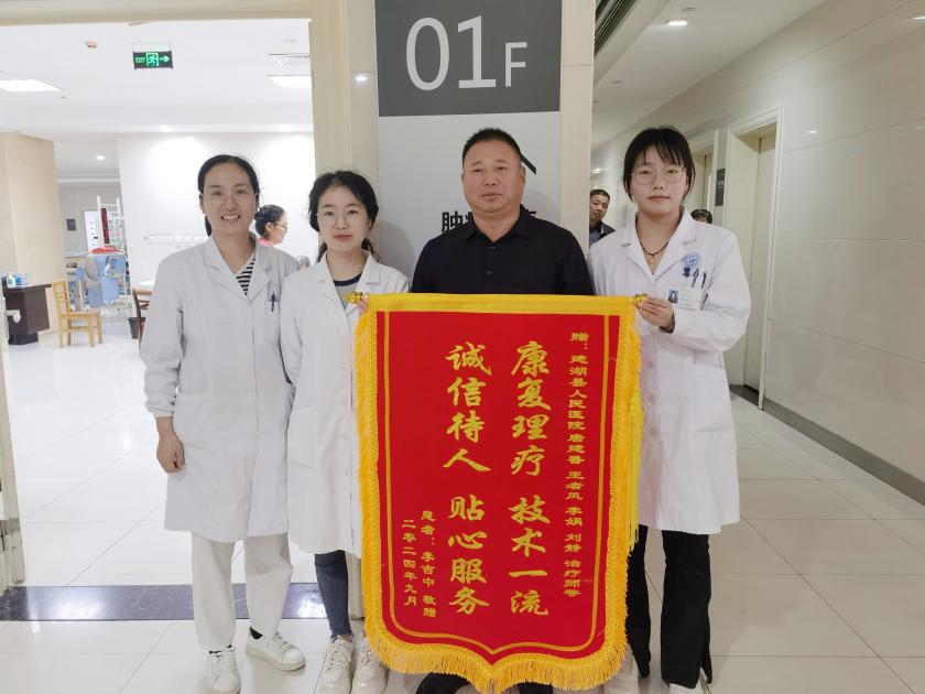 五十几岁的李伯伯,因左侧脑梗导致右侧肢体活动功能障碍入院治疗。刘静同学在带教老师的指导下,为李伯伯制定了一套全面的康复治疗方案。李伯伯起先不愿意配合治疗,在刘静同学细心劝解、热心帮助、耐心指导下,慢慢接受了康复治疗。在康复过程中,刘静同学每日认真执行康复计划中的措施,始终密切关注着李伯伯的病情变化,经过一段时间的共同努力,李伯伯病情得到了显著的改善,可以独立来医院复诊。为感谢康复科全体医务人员的辛勤付出,2024年10月11日,李伯伯为康复科老师及刘静同学赠送了一面锦旗。