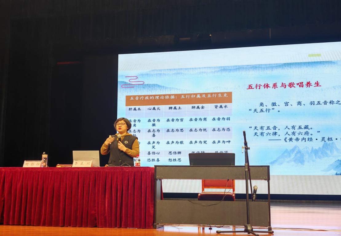 讲座伊始,李教授以“歌唱养生”引入主题,围绕人声乐器、音乐起源、情感动力、薬楽理念、生命之歌这五个维度,详细阐述了歌声为身心健康的积极影响。她从“薬楽”不分家这一独特视角出发,引领同学们从音乐歌唱的原理入手,深入了解自身身体结构。同学们通过歌唱练习,亲身体验呼吸、共鸣、发声、语言这四个歌唱系统,深刻认识到歌唱与身体间的紧密联系。