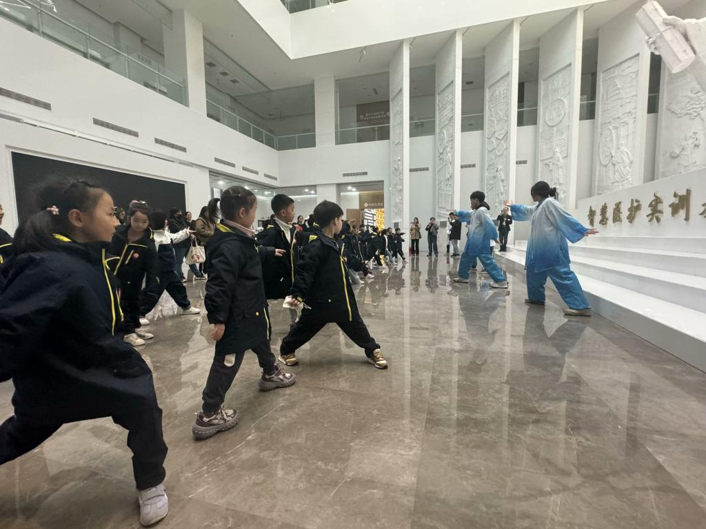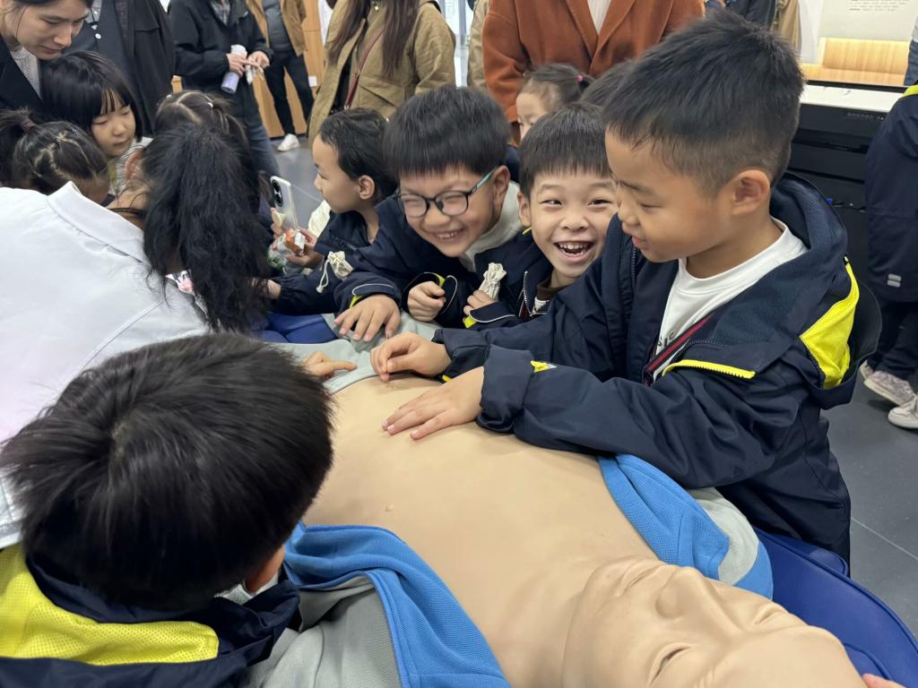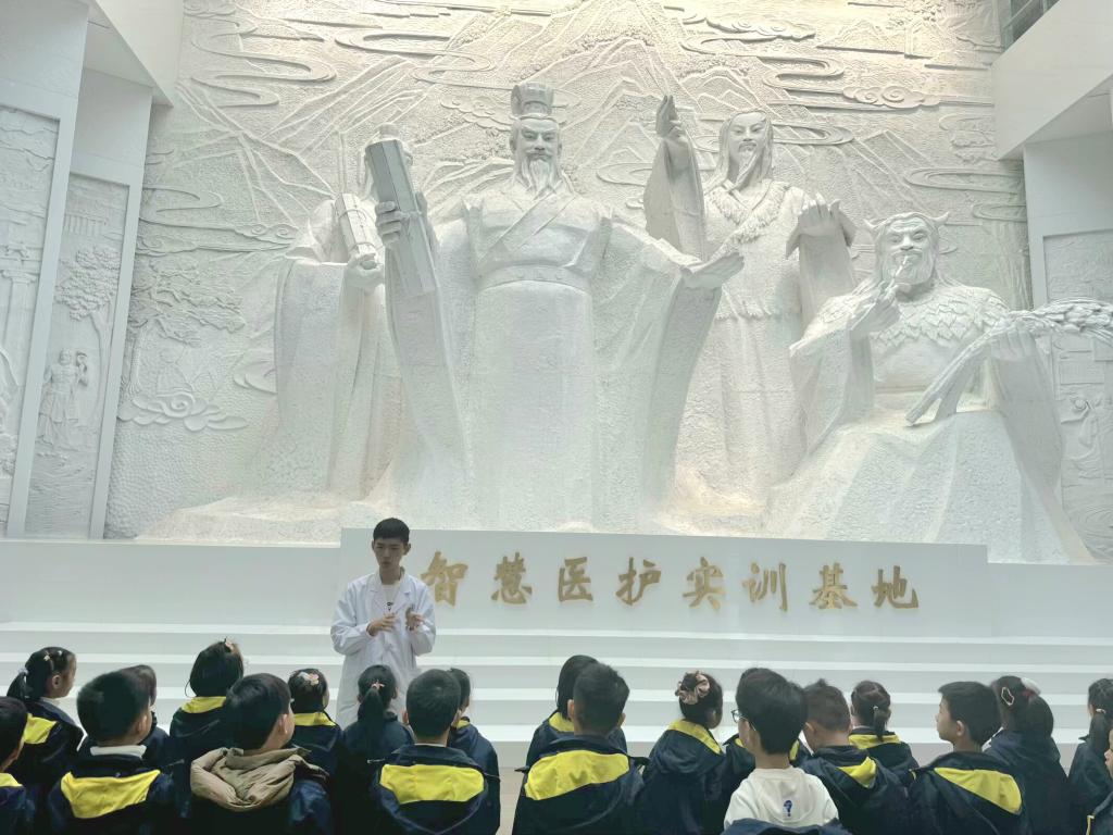 随后,小朋友们在志愿者的带领下走进智慧医护实训基地,分组交叉参观了宣誓大厅、中医实训区、中药实训区等区域。