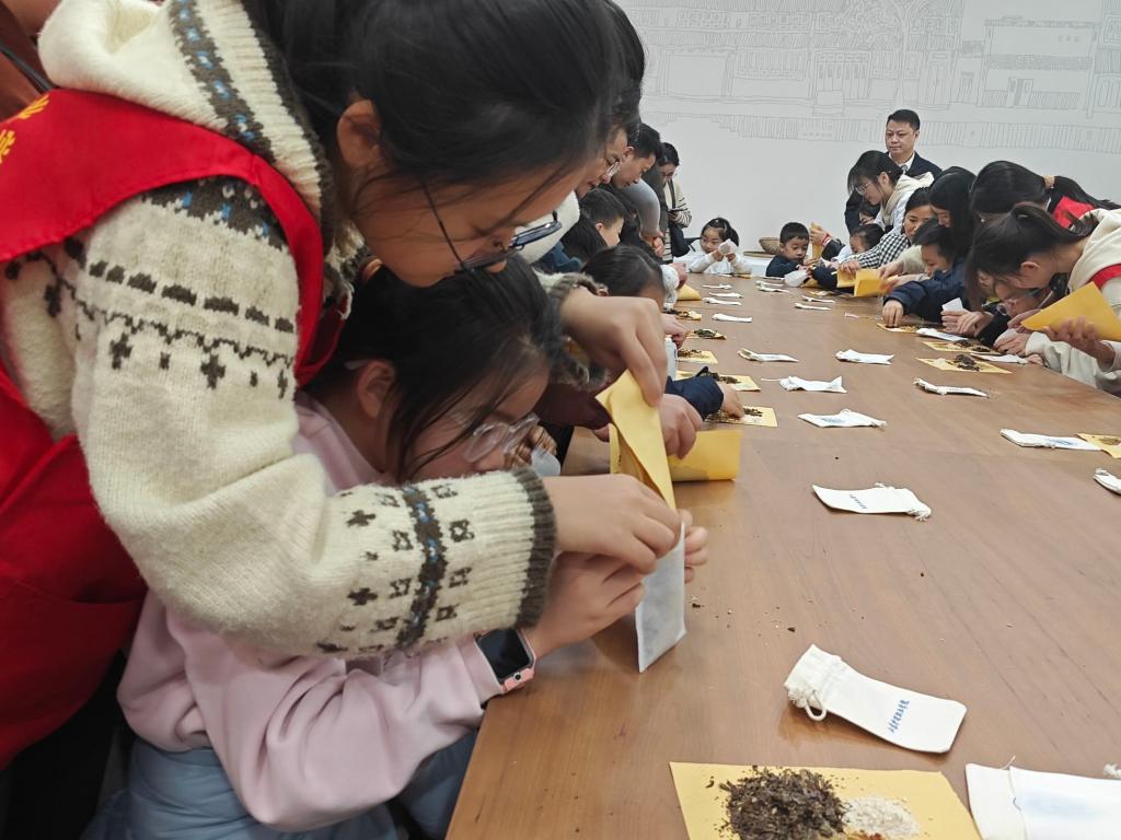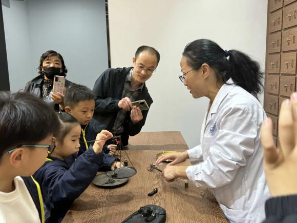 同时,中医药学院的党总支成员和学生志愿者化身讲解员,通过场景化的设计、沉浸式的互动体验,带领小朋友一起观看中草药标本、制作中药香囊、感受中医针灸、表演健身气功“易筋经”,帮助小朋友进一步领略中医药文化的内涵,建立中医药文化自信。