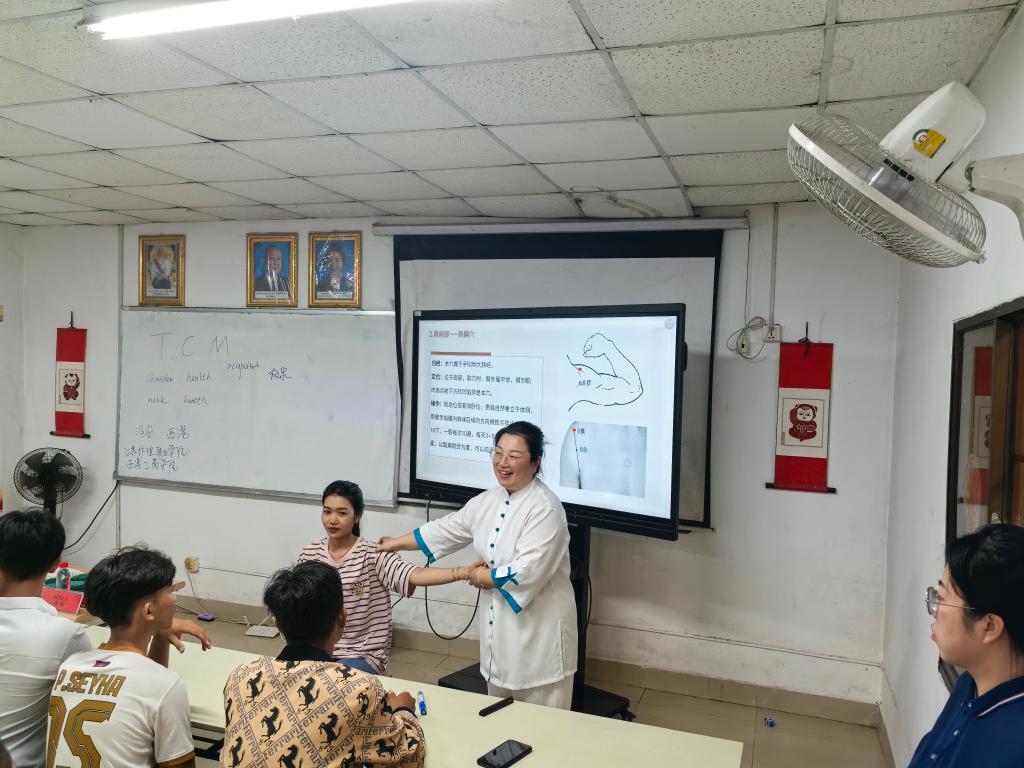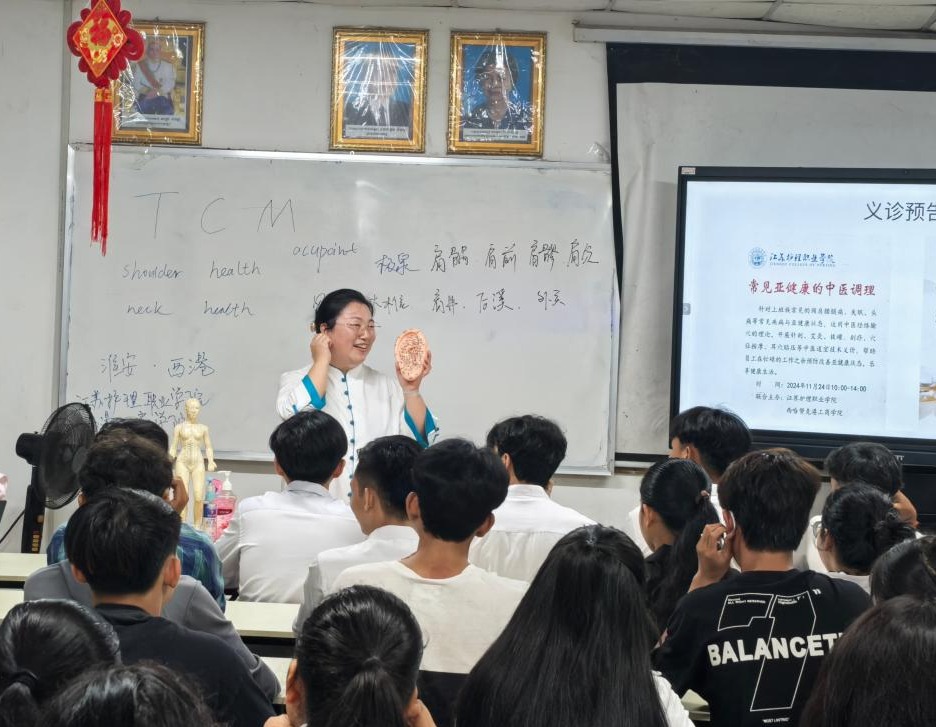 11月23日晚,团队一行在柬埔寨西哈努克港工商学院开展了“肩康有道、项领之功”--颈肩亚健康的中医调理主题培训。西哈努克港经济特区企业员工、西港工商学院师生共计49人参加了培训。校康复学院侯丽老师为大家讲解了颈肩亚健康中医调理常用的穴位推拿、艾灸、拔罐、耳穴以及中国传统功法等常用技术。培训现场,学员们积极参与互动,反响热烈。