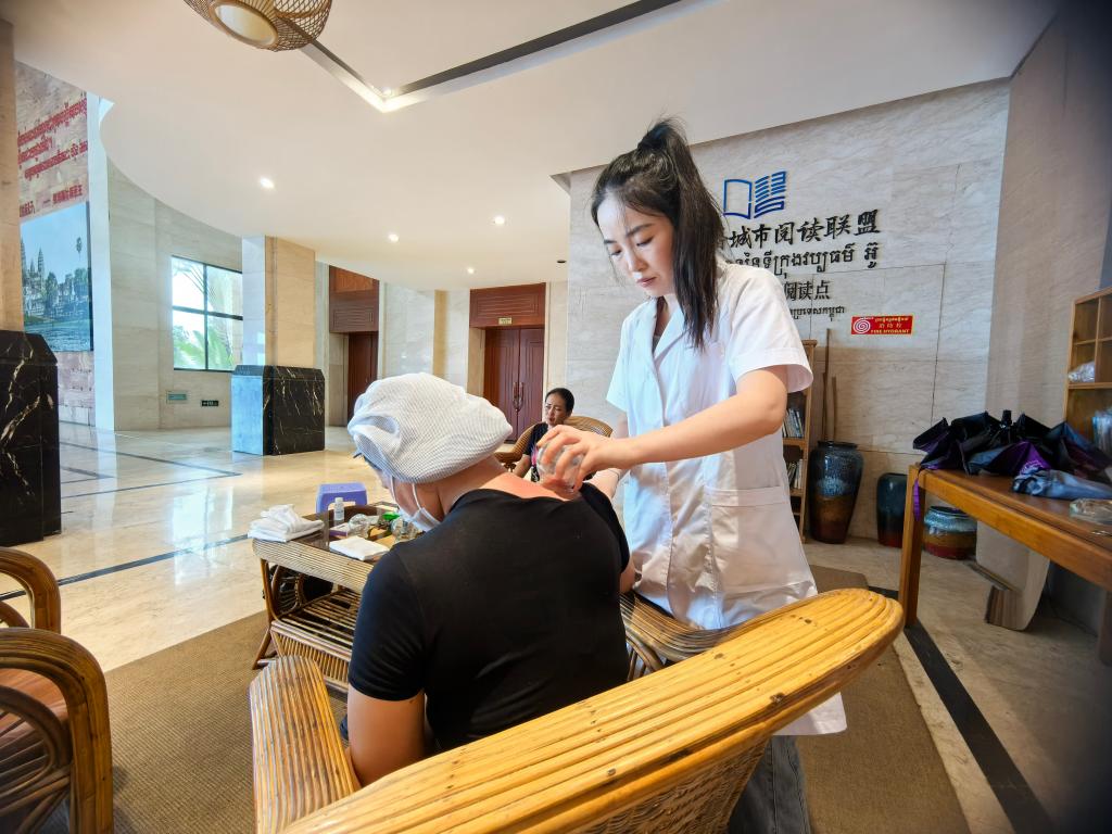 在柬期间,团队一行来到西哈努克港经济特区开展“常见亚健康的中医调理”义诊活动。校康复学院侯丽老师、中医药学院黄荣老师为前来就诊的当地民众与企业员工耐心细致地把脉问诊,运用针灸、推拿、刮痧、拔罐以及耳穴压豆等中医传统治疗方法进行了现场治疗,提供自我康复锻炼的健康保健指导。她们的精湛技术和温暖关怀,获得了就诊患者的认可与好评。