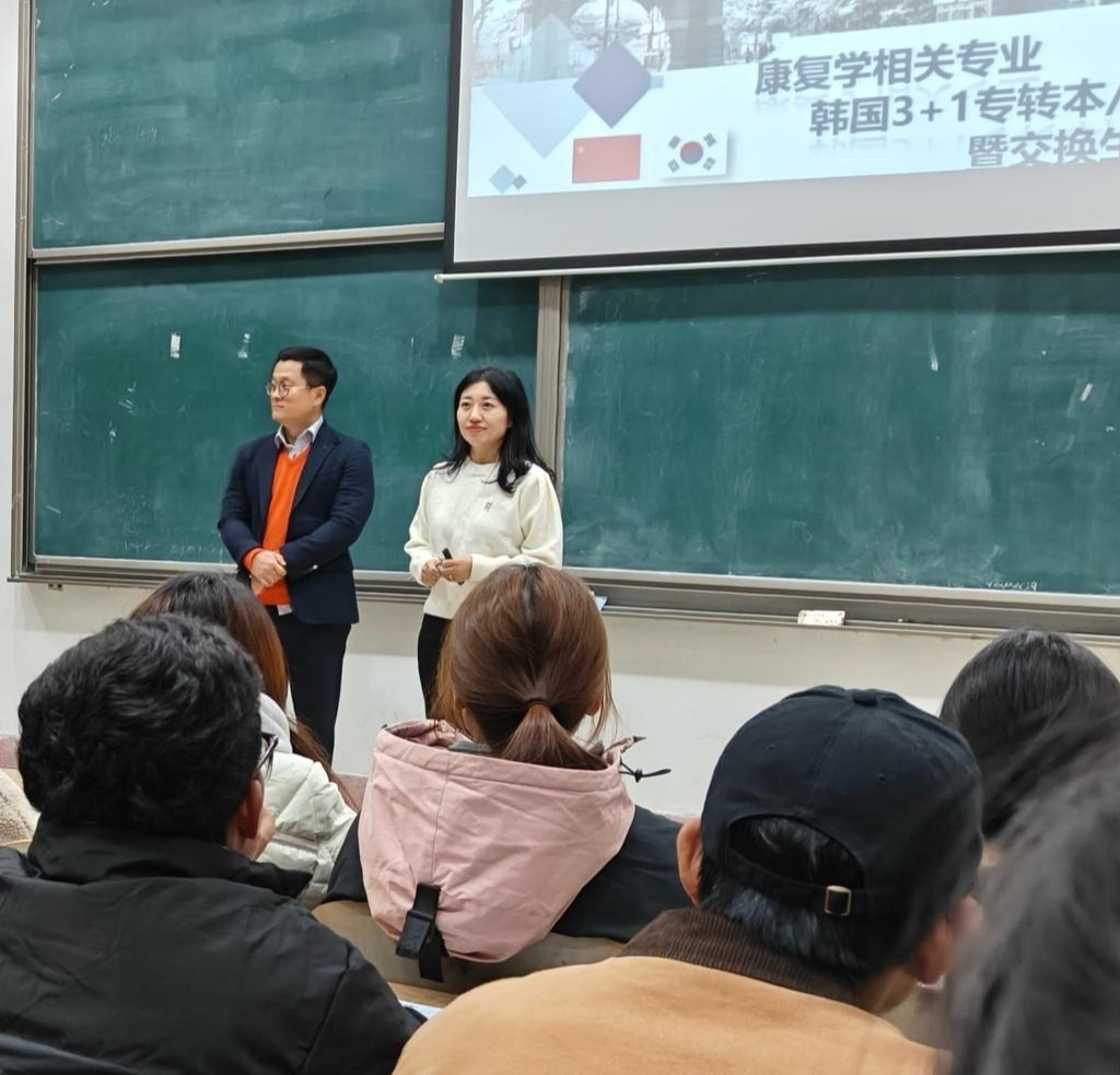 11月27日,我院于教学楼原阶一举办了韩国又石大学海外转本讲座。讲座特邀韩国又石大学国际交流院、全球教育支援中心负责人刘俊弘及韩国又石大学国际交流处项目主管李淑晓老师主讲,学工办主任陈银老师主持,康复治疗技术、中医康复技术、言语听觉康复专业同学踊跃参与。