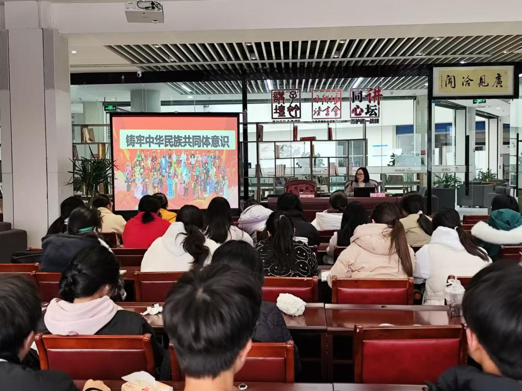 为将铸牢中华民族共同体意识融入办学治校、教书育人全过程,有形有感有效开展铸牢中华民族共同体意识教育,12月3日,今年会铸牢中华民族共同体意识宣讲团在图书馆楼“同心讲坛”开讲。今年会马克思主义学院周亚老师作题为《铸牢中华民族共同体意识》的授课,24护理学班全体学生聆听了宣讲。