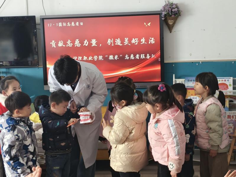 2024年12月5日是第39个“国际志愿者日”。为加强专业服务社会的功能,强化儿童群体对于口腔健康的认识,医学技术学院组织全国大学生口腔健康志愿宣讲团——“微米”志愿者服务队20余名同学于12月5日上午前往淮安市天津路幼儿园,为幼儿园中班和大班的全体小朋友开展了“12·5国际志愿者日-健康中国 从齿开始”口腔健康志愿宣讲活动。医学技术学院党总支副书记、关工委副主任杨海涛和辅导员张钰参与了活动。