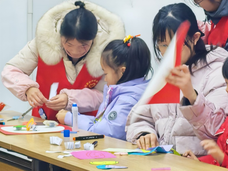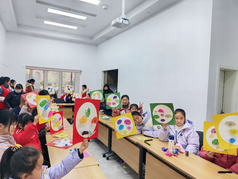 随后,进入了有趣的手工环节。志愿者们拿出彩色卡纸,带领小朋友们一起制作立体饺子。孩子们发挥着自己的想象力和创造力,将卡纸裁剪、折叠、粘贴,一个个可爱的立体饺子在他们手中逐渐成形。