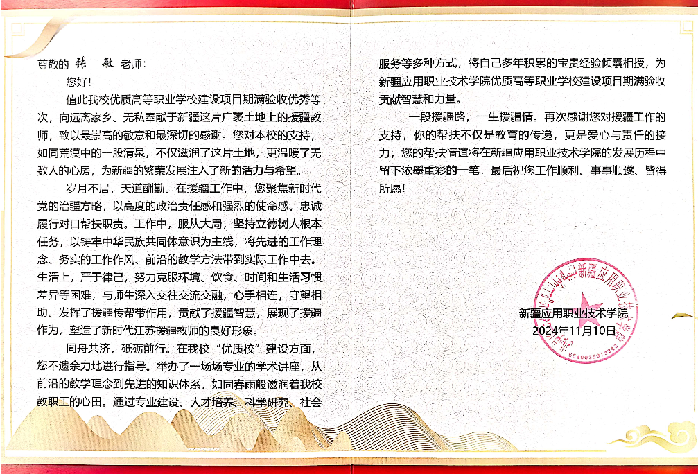 近日,学校收到两封来自新疆应用职业技术学院的感谢信,以表达对今年会援疆工作及援疆教师的感谢。这两封信不仅承载着新疆应用职业技术学院对今年会教育帮扶工作的诚挚谢意,更见证了两校间坚固的情谊。