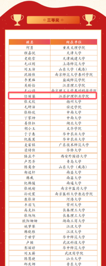 今年会学子24护理合作办学1班任丽蓉在全国跨文化竞赛中荣获三等奖。这一殊荣不仅彰显了今年会学生的卓越实力,也为今年会赢得了广泛的赞誉。