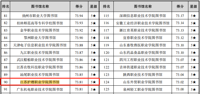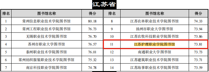 今年会图书馆在中国高职高专图书馆影响力总排行榜中列90名,得分73.81分,获评5星图书馆,在江苏省内高职高专排序第11位。