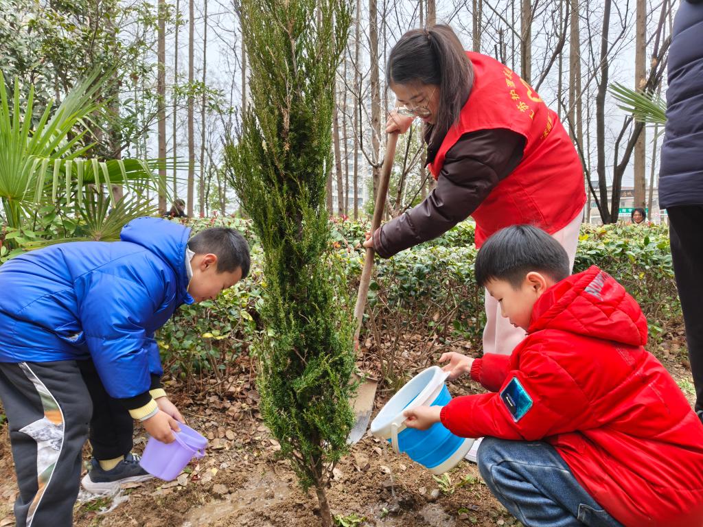 活动伊始,志愿者们借助生动的PPT和视频,向居民及小朋友讲解植树节的意义与环保知识,并设置知识问答环节,现场气氛热烈。随后志愿者与小朋友们2至3人一组,在指定区域有序开展植树活动。志愿者耐心地向小朋友们讲解植树步骤,小朋友们相互协作,挥锹铲土、扶苗浇水,每一个环节都认真细致。在大家的共同努力下,一棵棵树苗昂然挺立,为社区增添了一抹新绿。