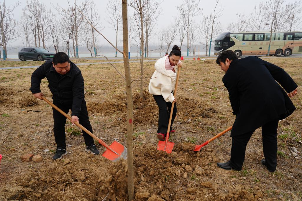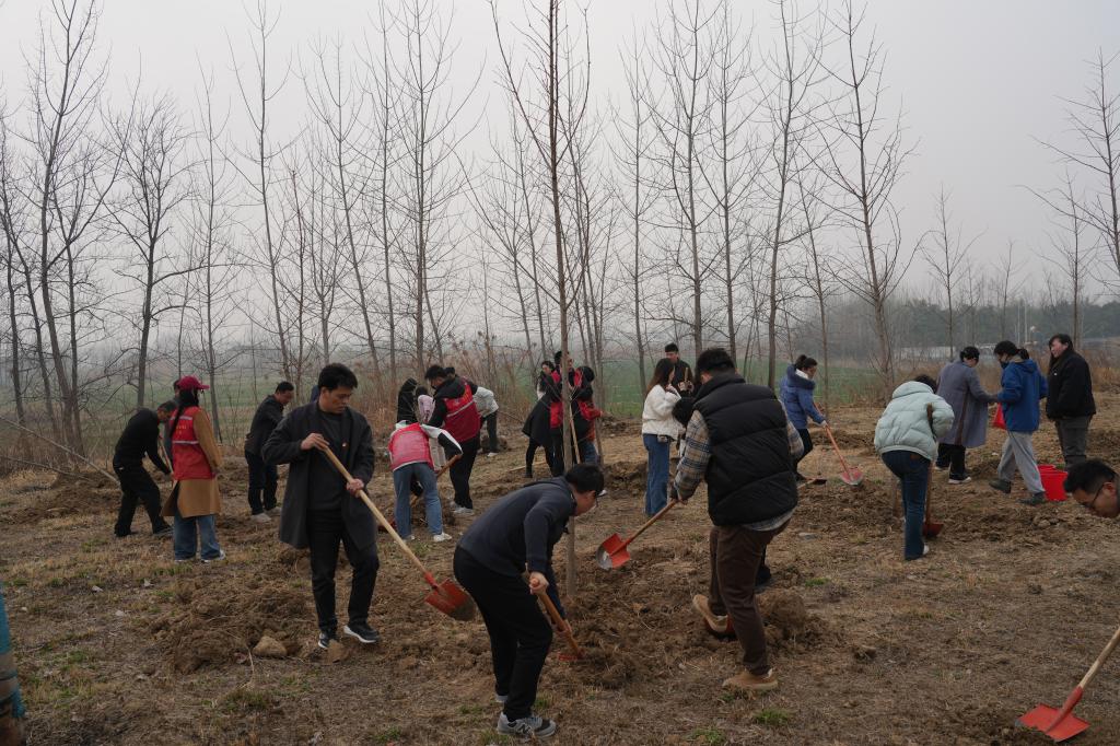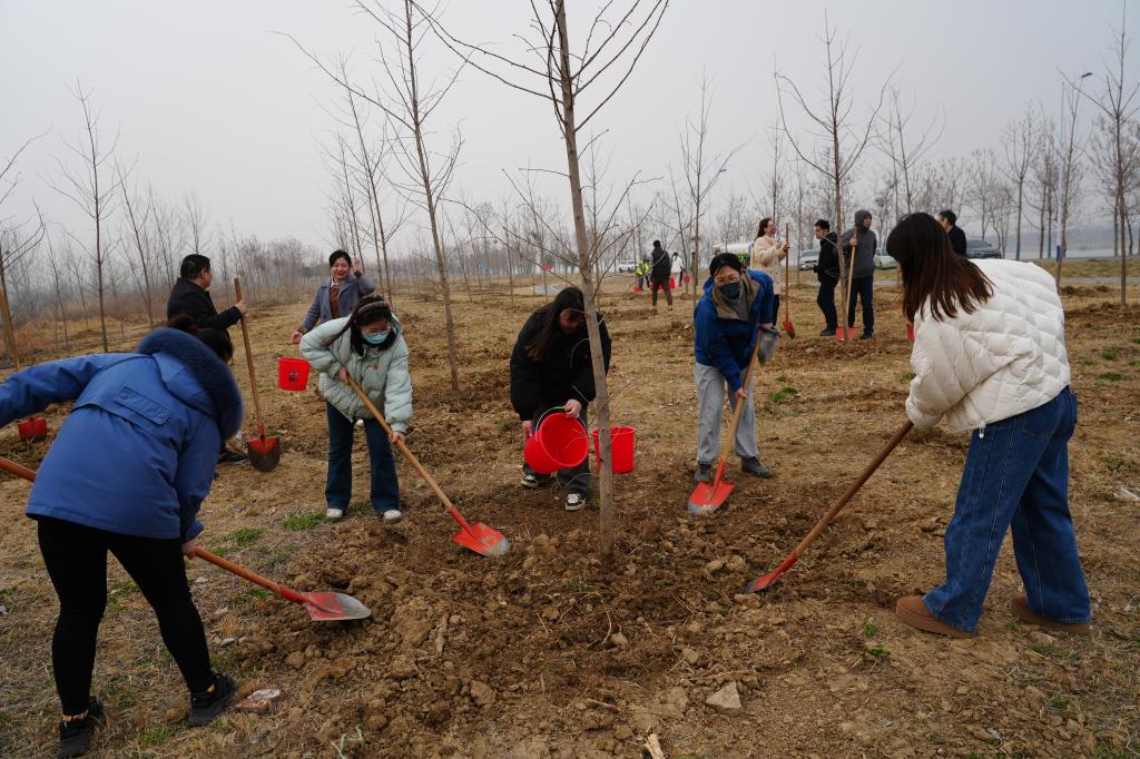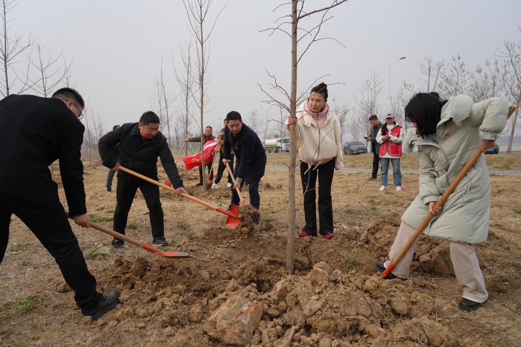 活动现场,党员们行动迅速,积极投身到植树实践中。三人一组、五人一群,分工协作、密切配合。挥锹铲土、扶树正苗、提水浇灌,各个环节衔接有序,忙而不乱。大家热情高涨,干劲十足,现场呈现出一片热火朝天的劳动景象。经过一个小时的辛勤劳动,数十株新栽树苗在土地上“安家落户”,整齐排列,在微风中摇曳生姿,焕发出勃勃生机。