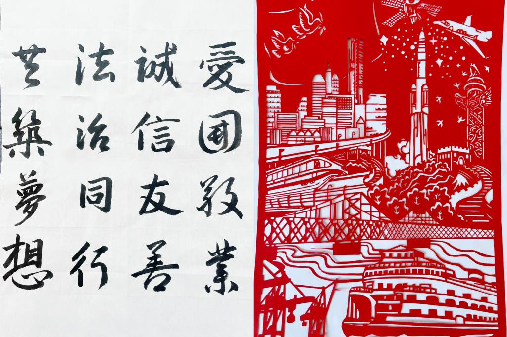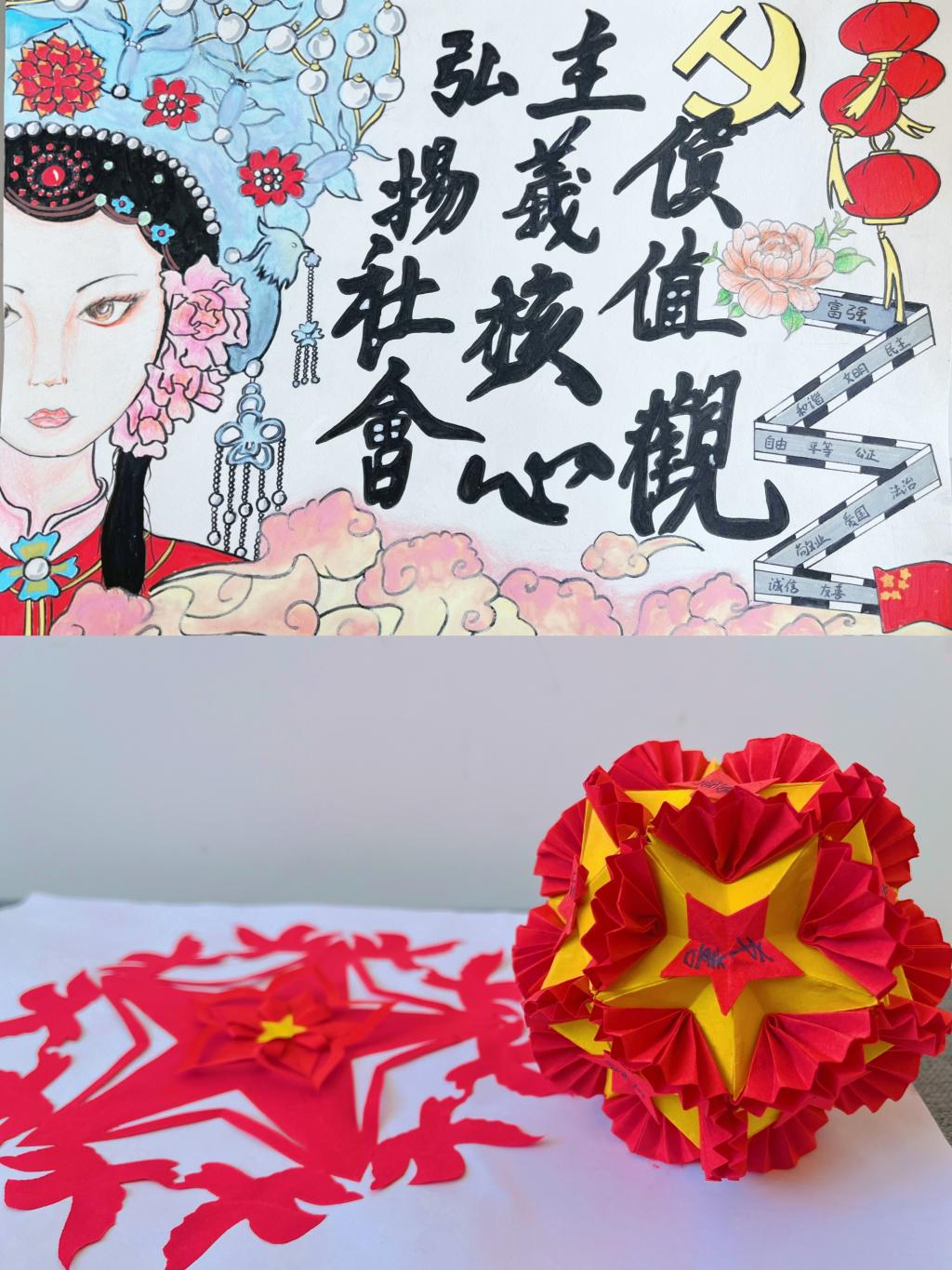 活动前期,校院两级学生会积极鼓励动员同学们参与“青春·绘梦”作品征集,共收到手抄报、剪纸、书法、绘画等作品百余份。同学们以笔墨书写家国情怀,用剪刀镌刻文化自信,让抽象的价值理念化为可观可感的艺术表达,展现了苏护青年对核心价值观的深刻感悟。