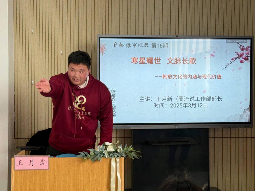 王月新老师通过引用《师说》等经典古文,带领大家了解韩愈、介绍韩愈的生平事迹,围绕其对中国历史的影响、儒学复兴、古文的儒家内涵这三方面展开讲解,阐述韩愈弘扬道统、提倡师道、文以明道的思想,详细展现韩愈对儒学复兴的贡献,引导学生传承和弘扬韩愈明道传道学道的师道精神。