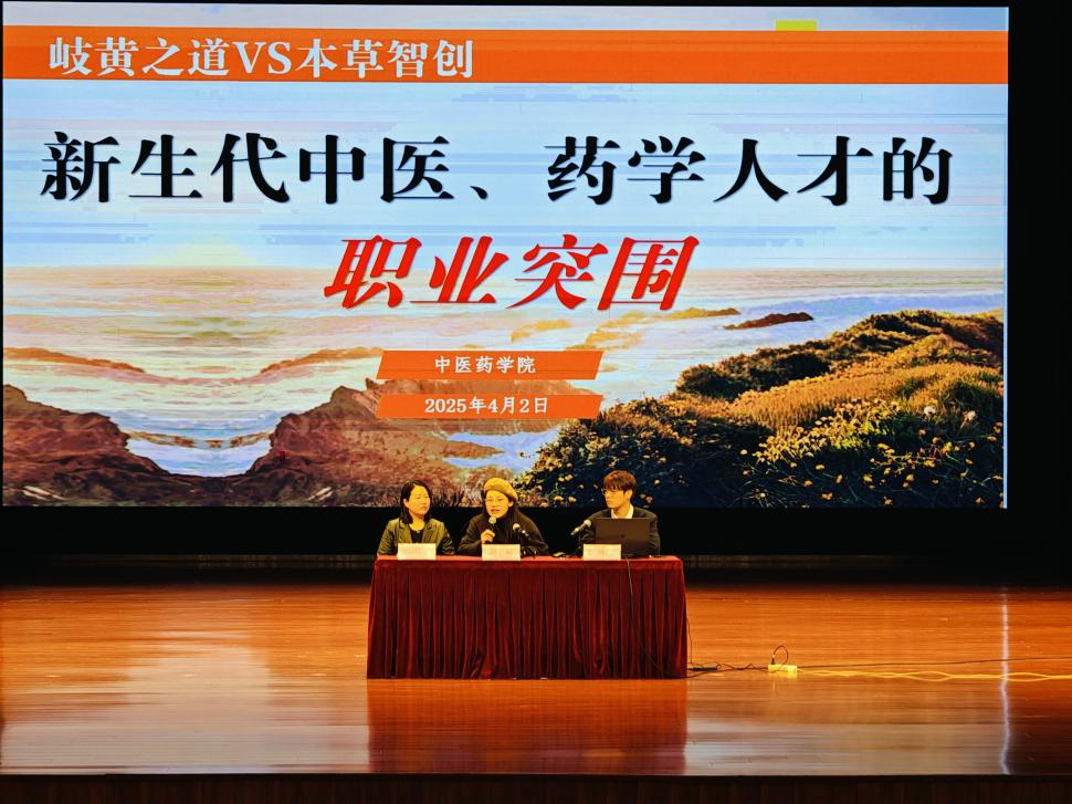 为提高学生的职业生涯规划意识,加深职业认知深度,拓宽职业探索广度,4月2日,中医药学院在大学生活动中心举办了“新生代中医、药学人才的职业突围”专题讲座。本次活动由学院职业生涯规划教研室主任李明晋老师主持,优秀校友曹致凯和周颖担任主讲嘉宾。学院党总支书记韩永红、全体辅导员和班主任参加了本次活动。
