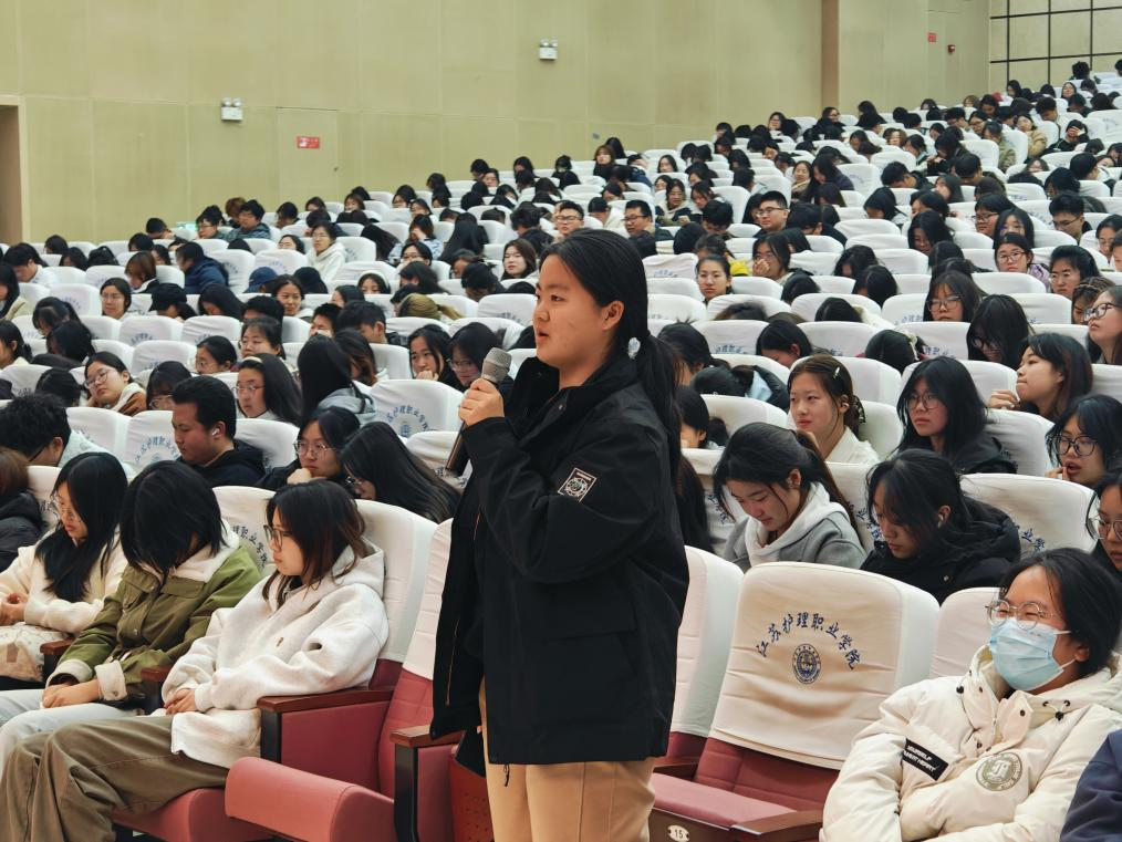 在互动环节,同学们踊跃提问,现场气氛达到高潮。对于同学们关心的就业方向、就业选择及求职经验等问题,曹致凯和周颖都一一耐心解答,并分享了优化简历、提升面试技巧、参加执助考试注意事项等实用经验和建议。