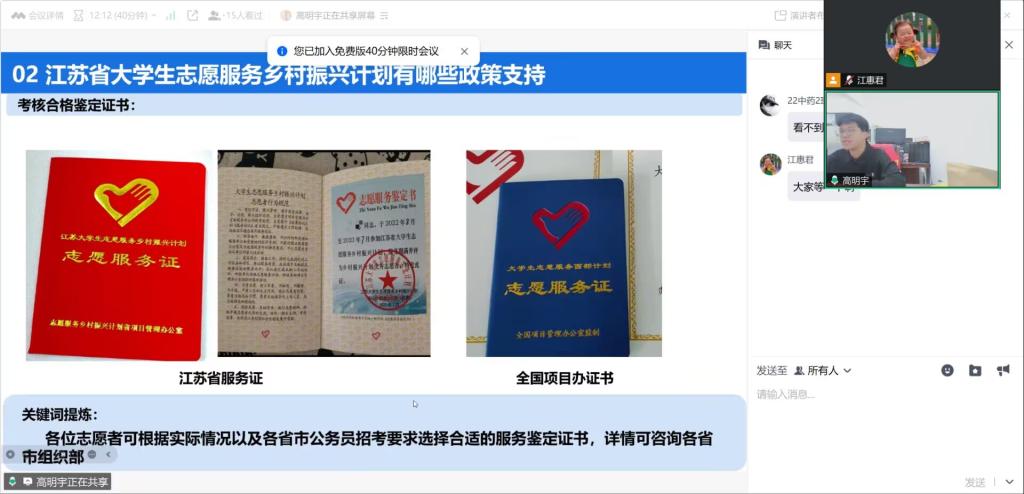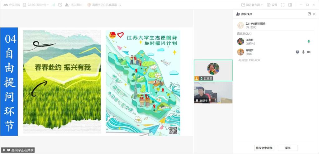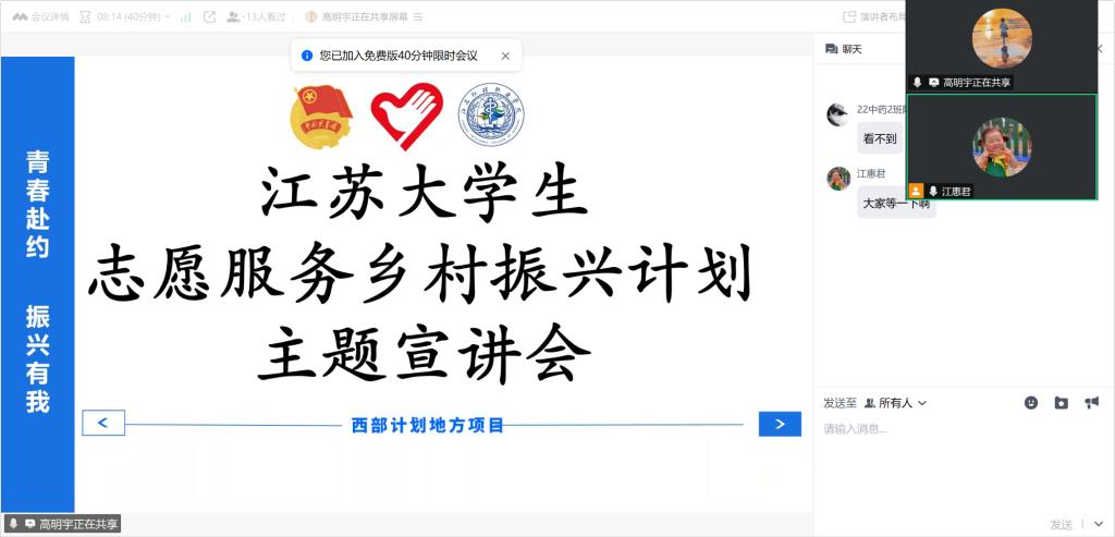 会议开始后,21药管班高明宇同学从项目核心内容、政策扶持细节、报考流程步骤等方面入手,为大家系统解读江苏大学生志愿服务乡村振兴计划。他着重介绍计划政策知识与报考注意事项,还分享了个人日常工作场景,帮助同学们直观感受志愿工作。随后,21药产班戴文艳同学结合自身在淮安市金湖县的服务经历,为大家讲述基层工作故事,并针对同学们关心的薪资待遇、职业发展等问题,进行细致解答,鼓励同学们用青春力量为乡村发展添砖加瓦。在自由交流环节,同学们踊跃提问,两位主讲人耐心回应,线上交流氛围热烈。