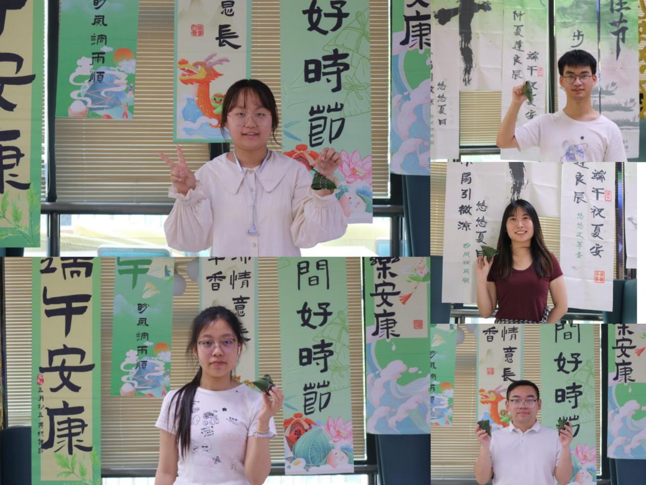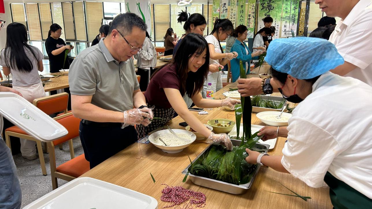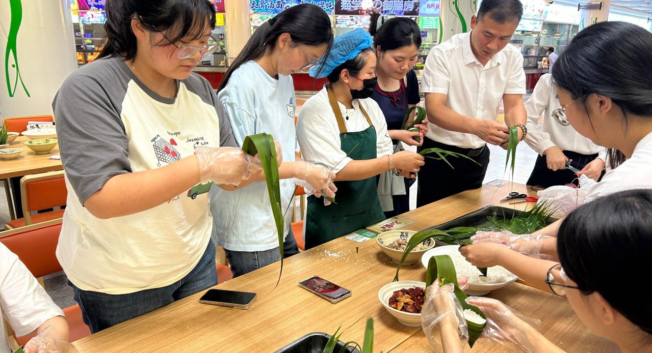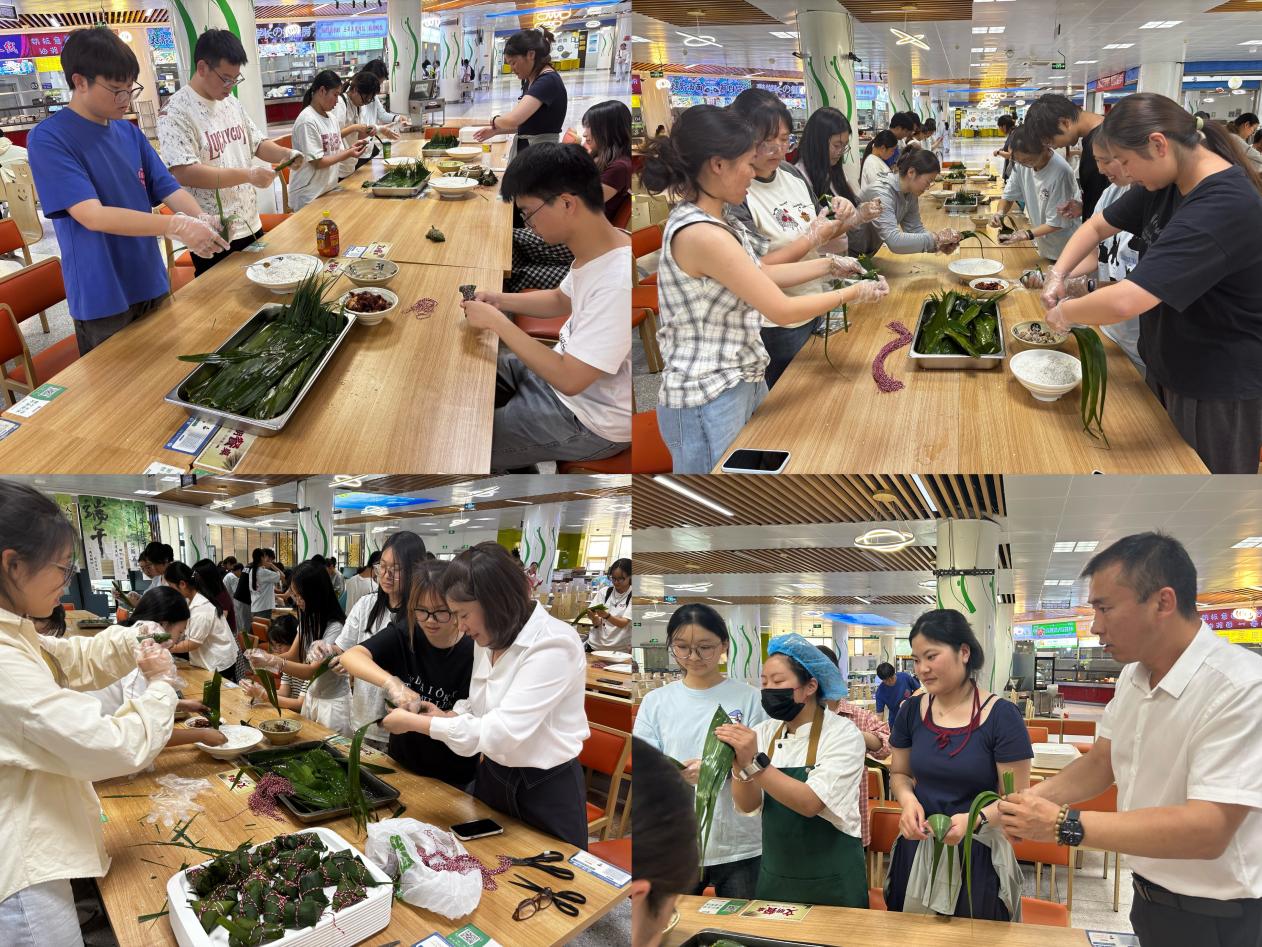 随后,包粽子环节正式开始。浓郁的粽香与欢快的氛围交织在一起。食堂内,糯米、红枣、粽叶等食材整齐摆放,等待着大家一展身手。在食堂阿姨的亲切指导下,同学们慢慢掌握了方法,大家互帮互助,卷粽叶、填糯米、放馅料、扎绳子,动作一气呵成。在包粽子的过程中,师生们围绕端午节的文化内涵展开热烈讨论。大家纷纷表示,端午节不仅是一个传统节日,更是中华民族精神的象征。屈原的爱国精神穿越千年,依然激励着当代青年。师生们在欢声笑语中增进情感交流,凝聚团结力量。