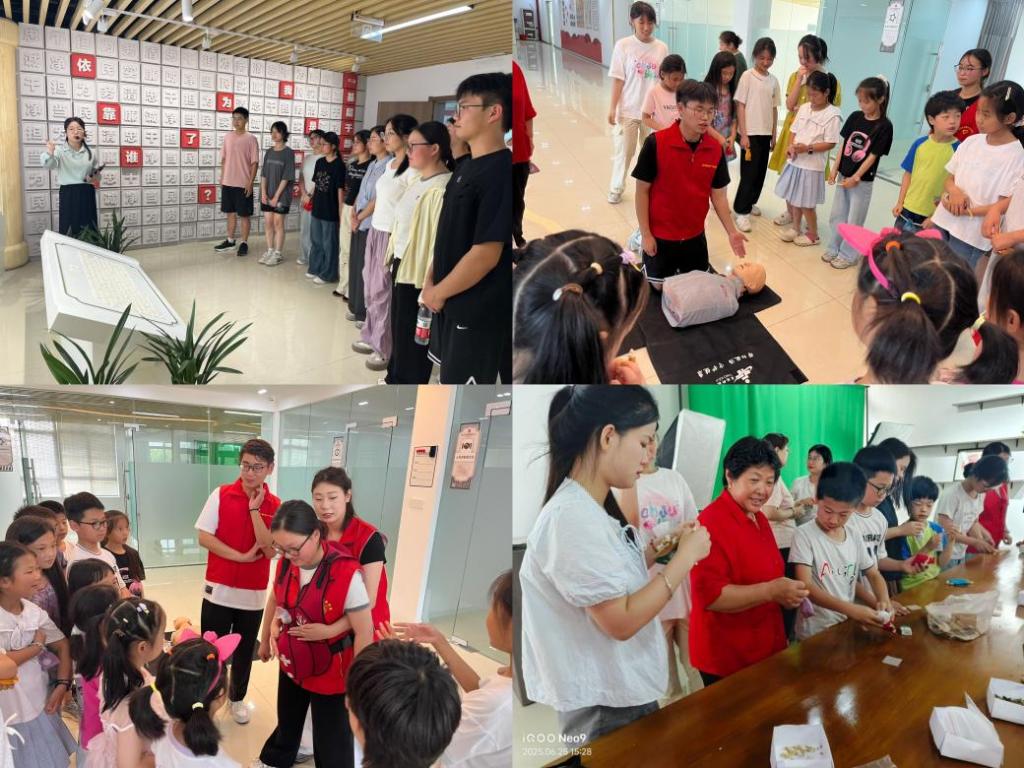 随后,学生志愿者向社区居民普及急救知识与技能,学生志愿者结合模拟人教具,详细演示心肺复苏、海姆立克急救法等关键时刻的救命技能,分步讲解操作要领,强调黄金救援时间的重要性,以急救知识赋能生命守护。同时,学生代表介绍中药香囊的文化内涵与实用价值,展示艾草、薄荷、白芷等常见中药材的功效。在党员教师的指导下,吴圩村的小朋友亲手制作了驱蚊香囊,深刻感受中医药传统文化的独特魅力。